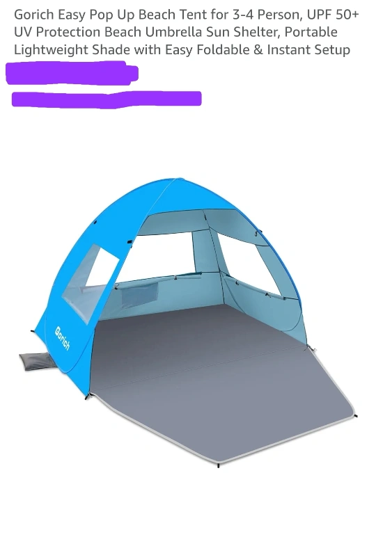 Gorich Easy Pop Up Beach Tent for 3-4 Person, UPF 50+ UV Protection Beach Umbrella Sun Shelter, Portable Lightweight Shade with Easy Foldable & Instant Setup pick up Edmonton cash no transfers.