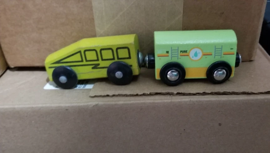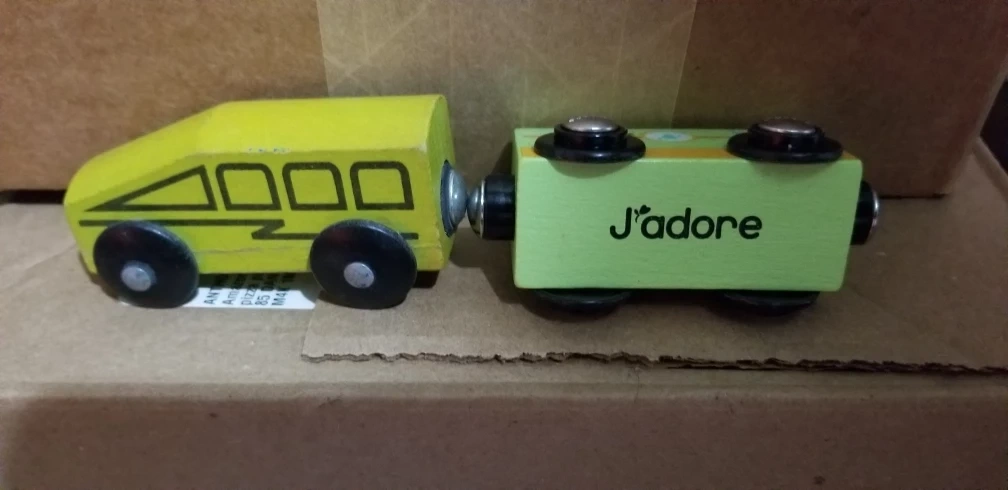Here's a cute J'adore wooden train car set! It's in great shape and ready for a new home. Perfect for little conductors and imaginative play