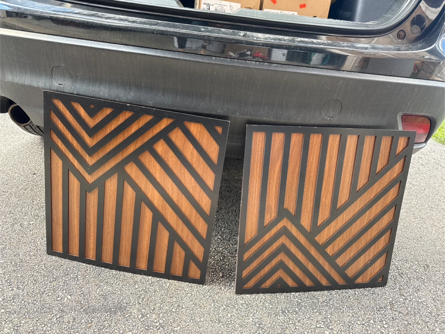 Two pieces of geometric wall decor. They feature a wood grain background with a black geometric design overlay. Perfect for adding a modern touch to any room