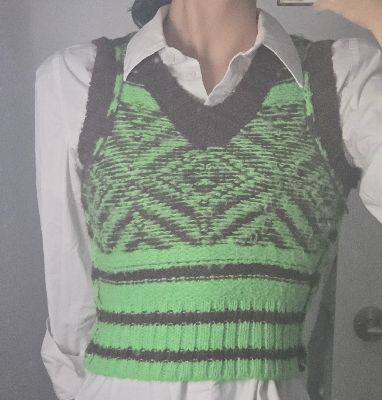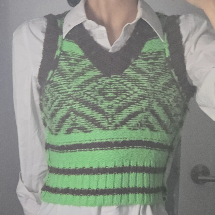This is a cozy BDG knitted sweater vest in size XS. It features a unique pattern with green and brown colours. Perfect for layering this fall!