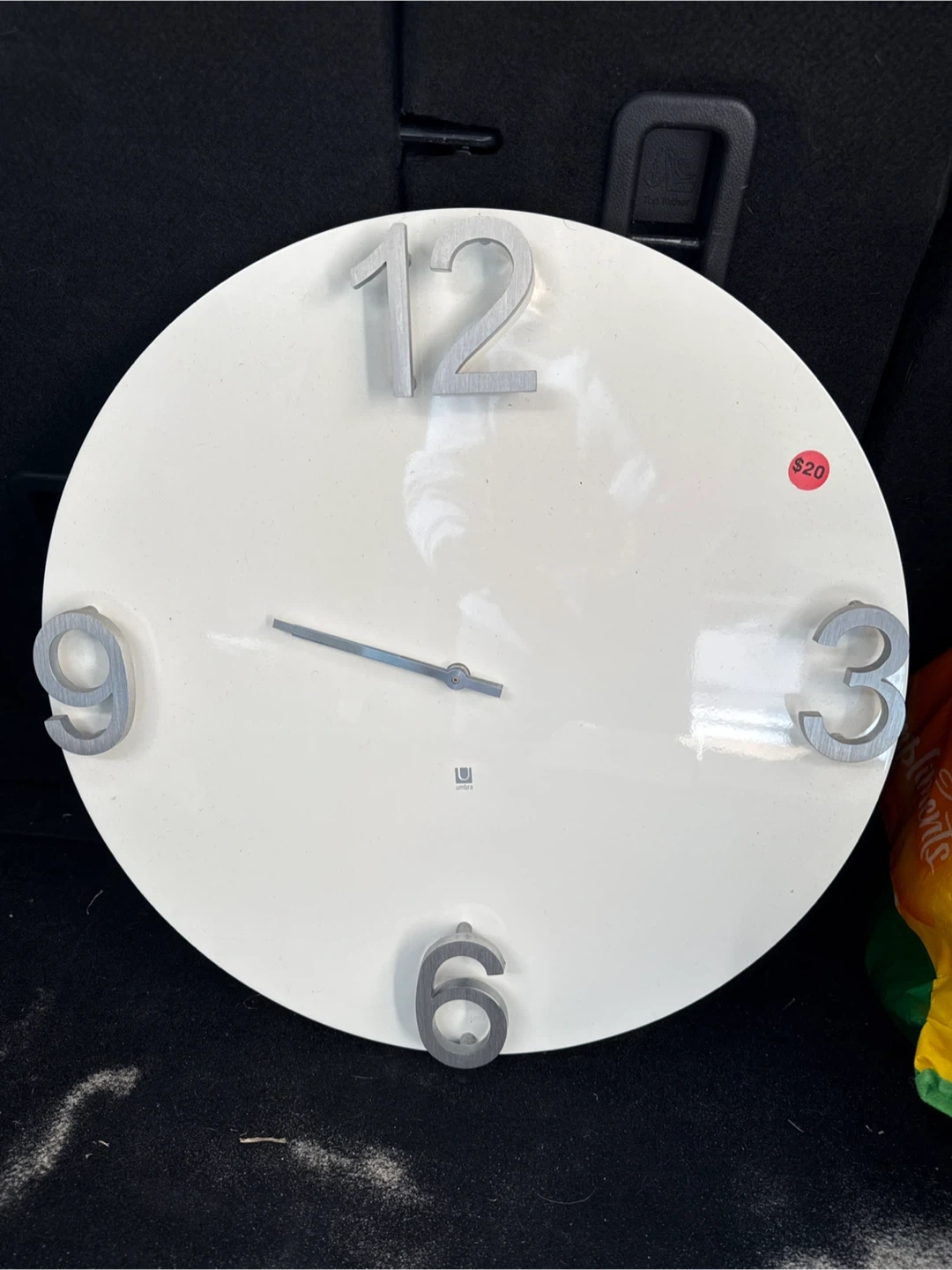 Selling a nice Umbra wall clock! It's in great shape and would look great in any room. The clock face is white with silver numbers.