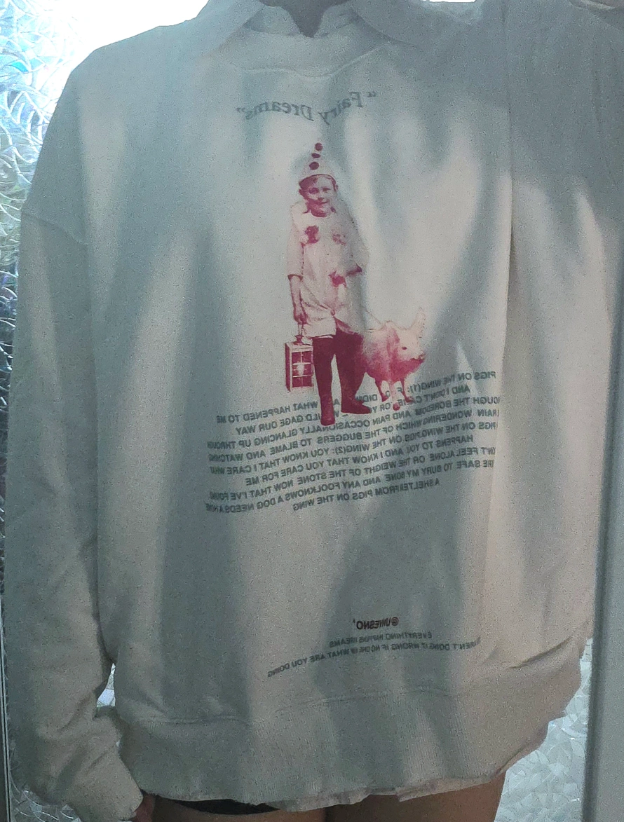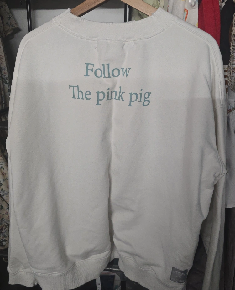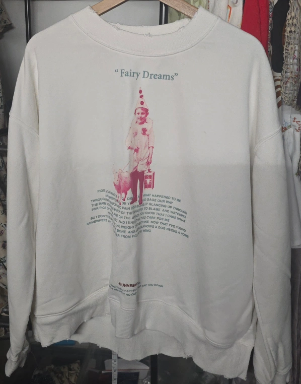 Selling a gently used Unvesno sweatshirt with a unique 'Fairy Dreams' design! It's a cozy and stylish piece that's sure to turn heads. The design features a vintage-inspired graphic on the front and 'Follow the pink pig' on the back. Perfect for adding a touch of whimsy to your wardrobe. Probably one-of-a-kind or limited edition.