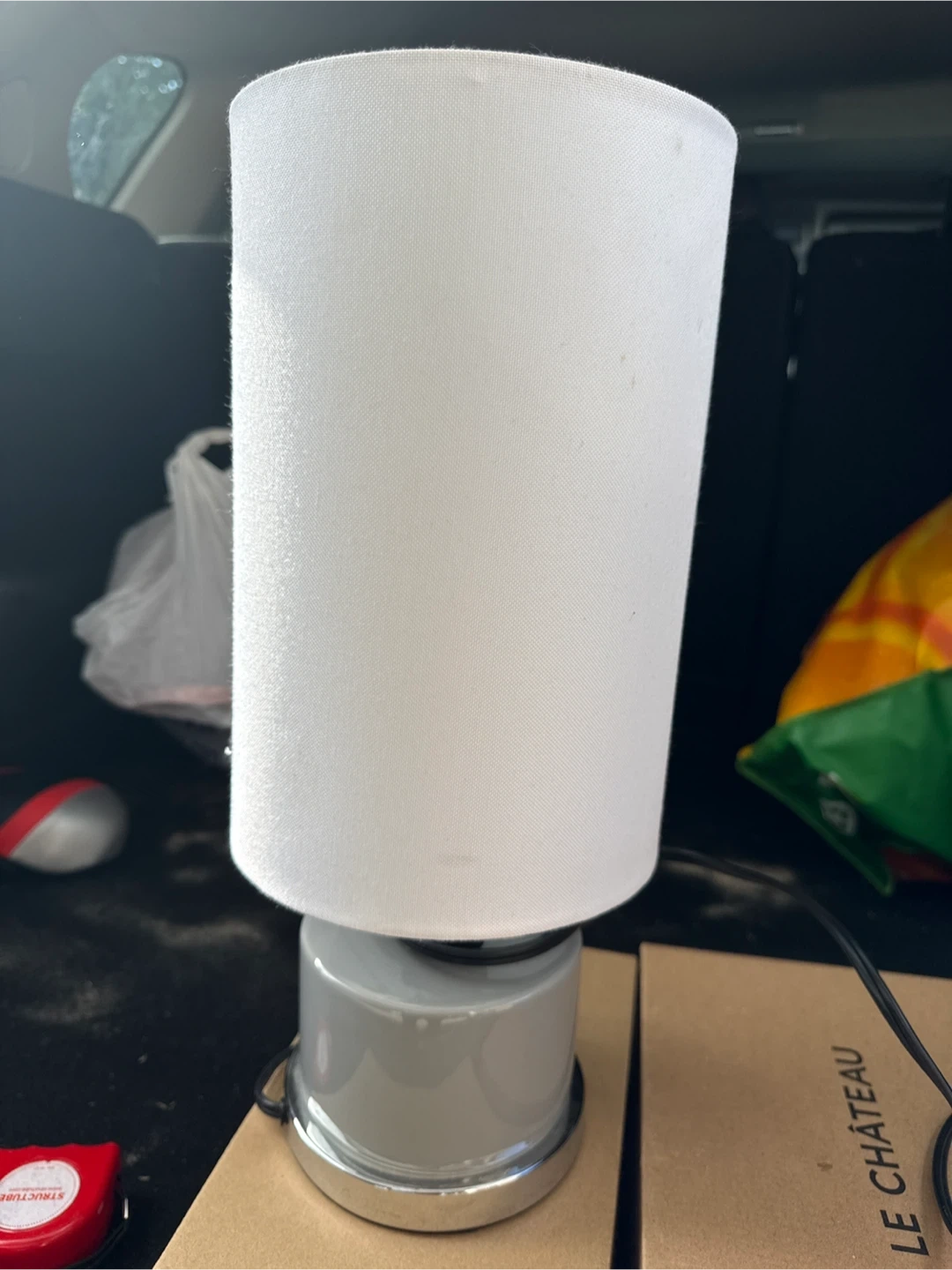 Here's a nice table lamp from Le Chateau! It has a white fabric shade and a gray base. It is in great condition and ready to brighten up your space