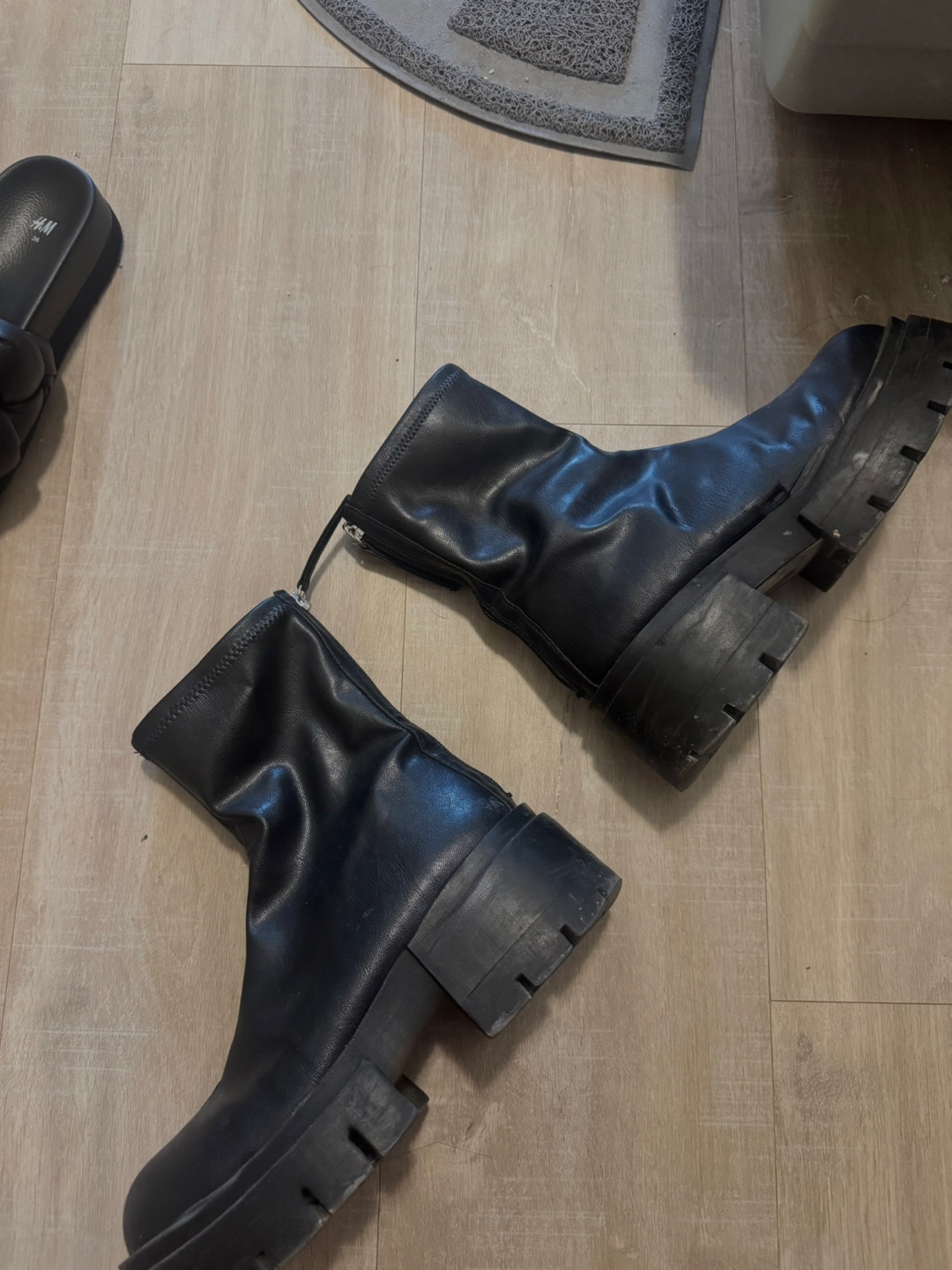 Selling a pair of black ankle boots from H&M. They have a chunky heel and a zipper on the side. Great for adding a bit of edge to any outfit!