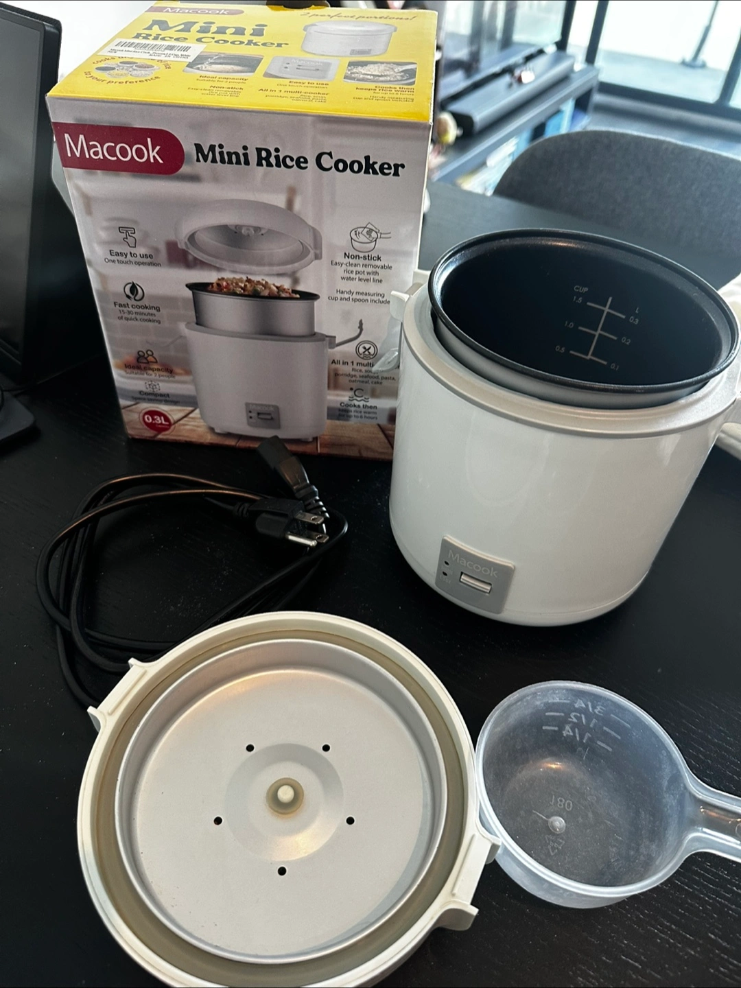 Selling a Macook Mini Rice Cooker. It's a compact design with a 0.3L capacity, perfect for 2 people. It's easy to use with one-touch operation and cooks rice quickly in 15-30 minutes. It's also an all-in-one multi-cooker for rice, soup, porridge, seafood, pasta, oatmeal, and cake. The box is included!