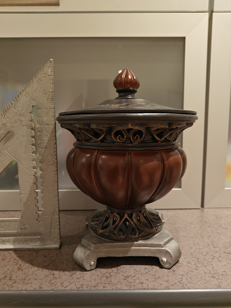 I'm selling a decorative container with a lid. It has a unique design and would look great in any room. It's in great condition and ready for a new home!