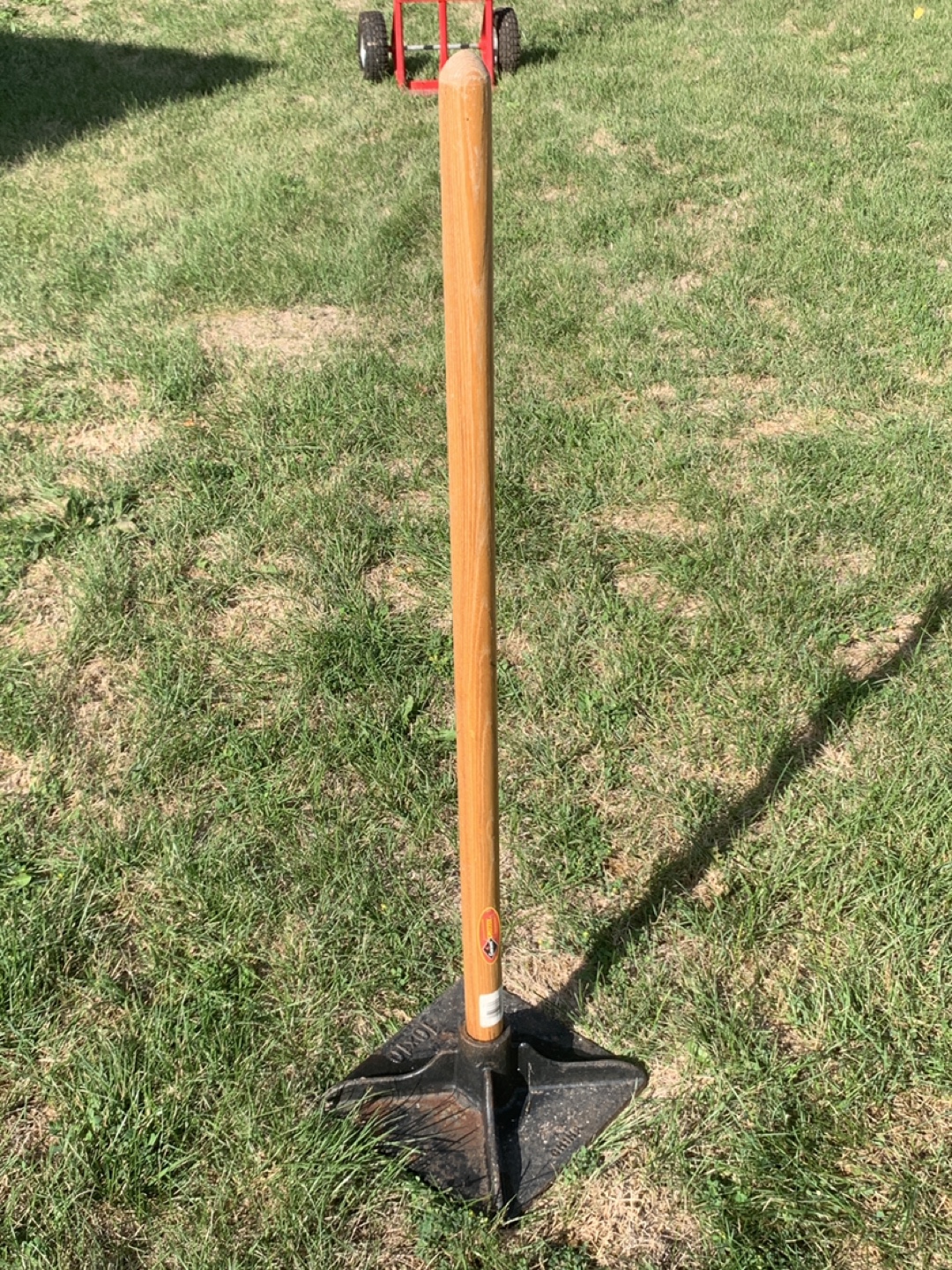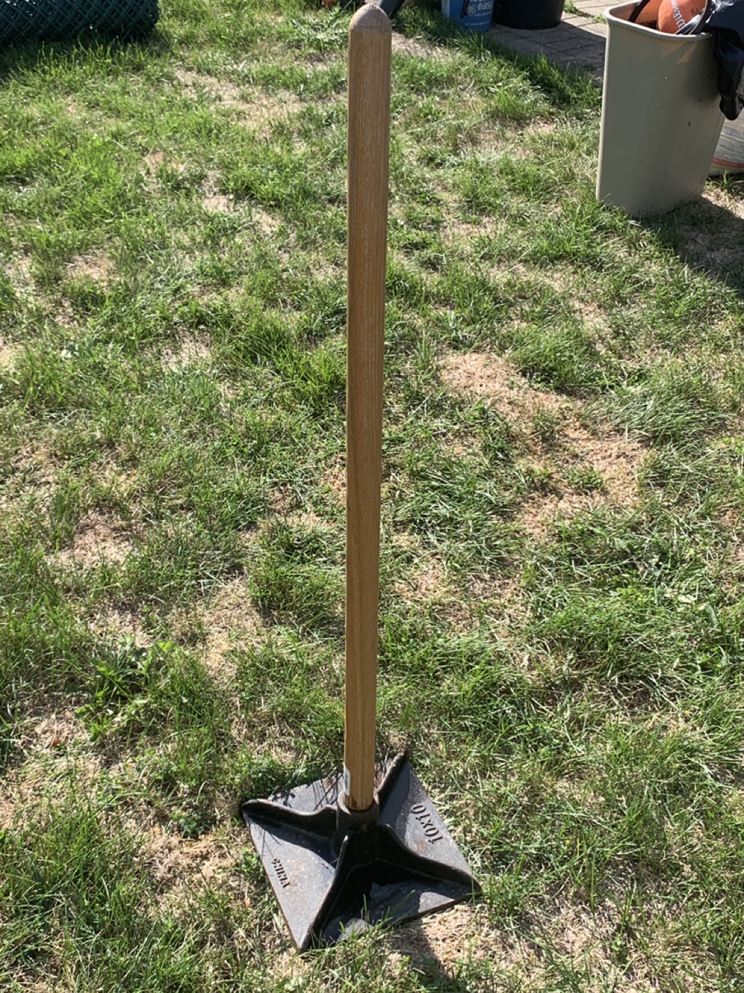 Soil / gravel metal tamper in good condition, ready to help with your landscaping or construction projects.