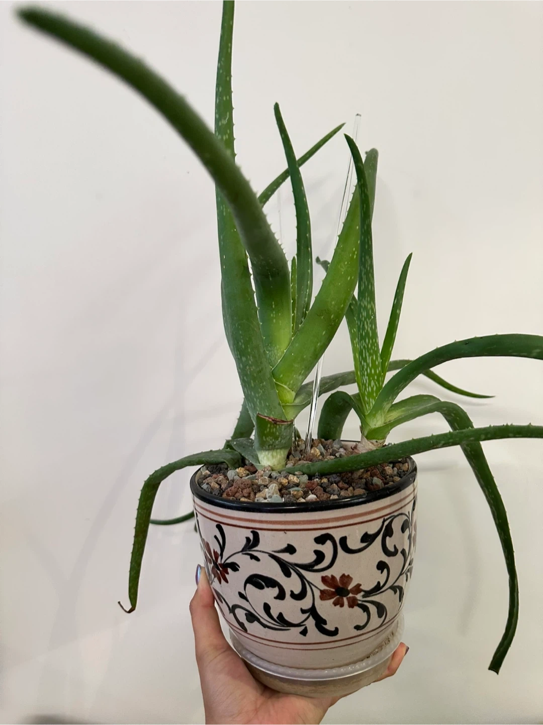 2 large aloe vera plants growing in a vintage ceramic planter.