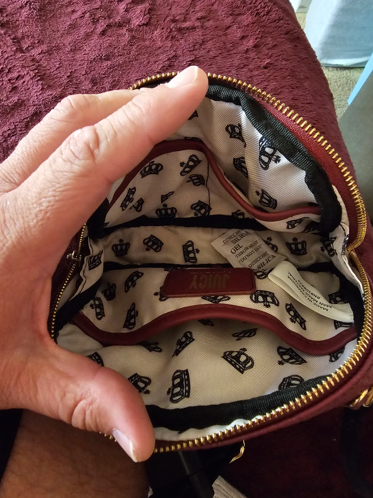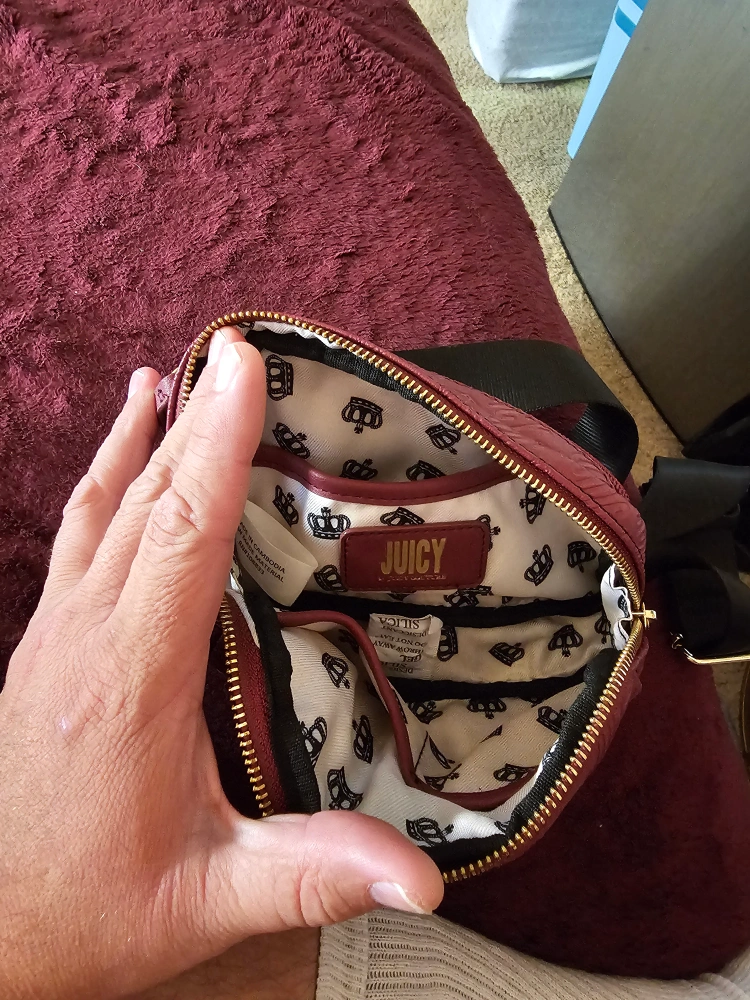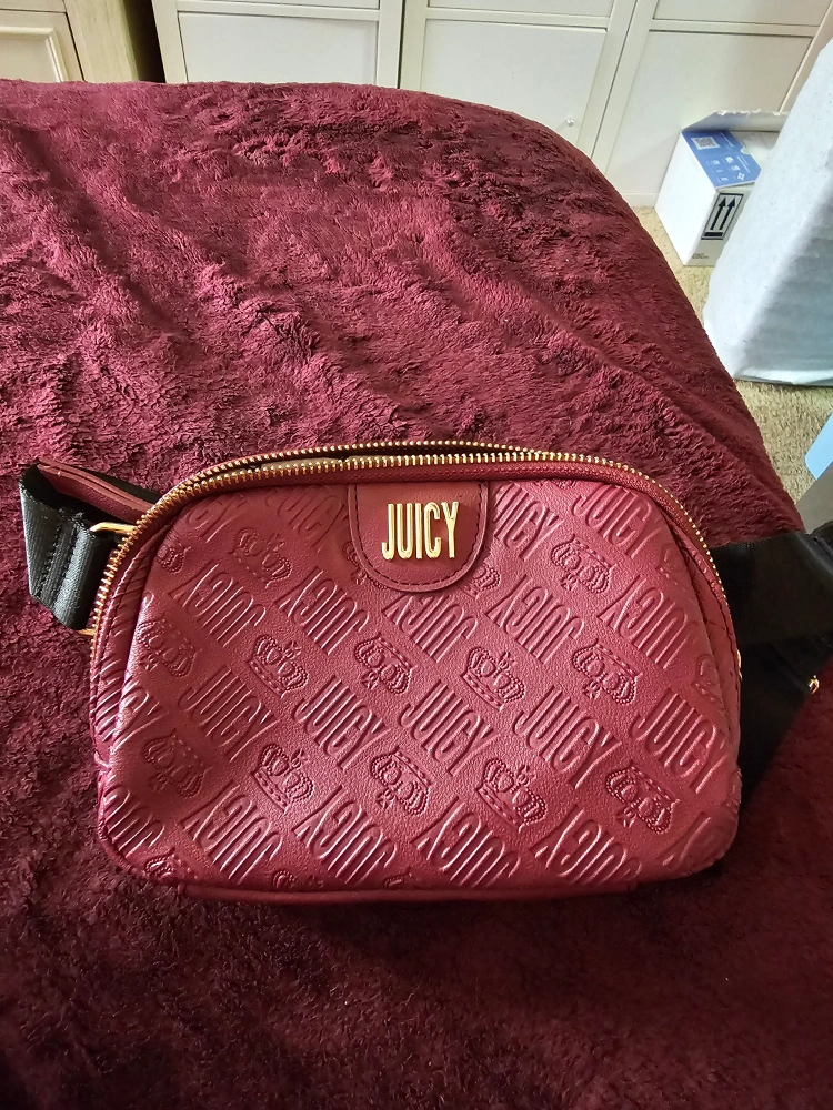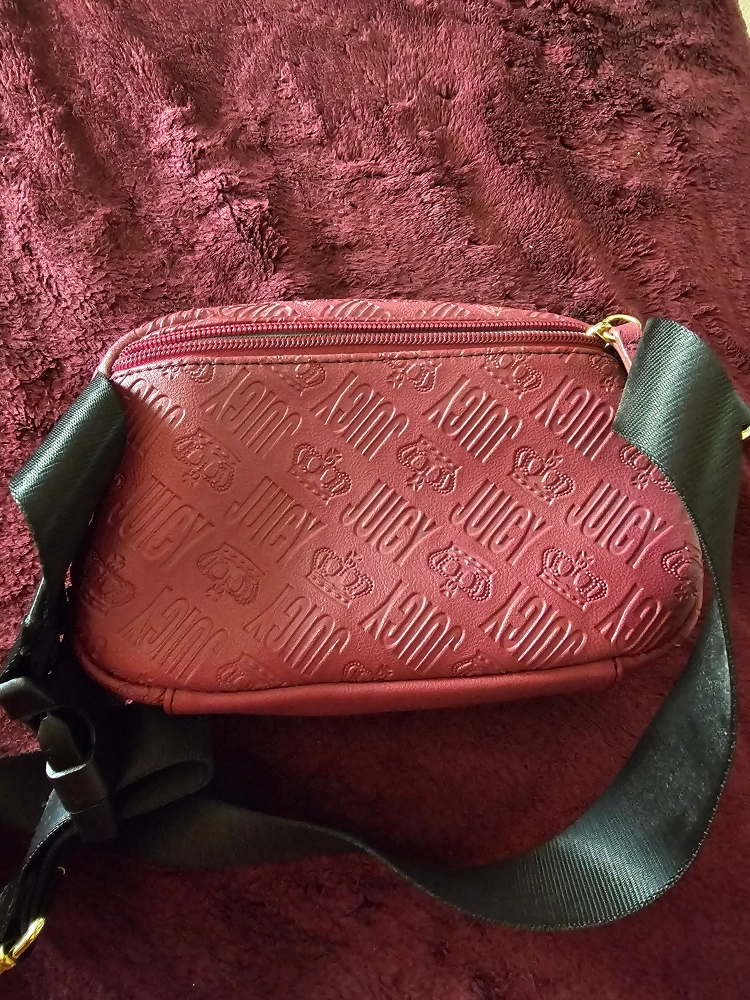 Selling a cute Juicy Couture belt bag! It has a unique embossed design and a stylish interior lining with the Juicy crown pattern. The material is man-made for durability and easy care. Perfect for adding a touch of glam to your outfit