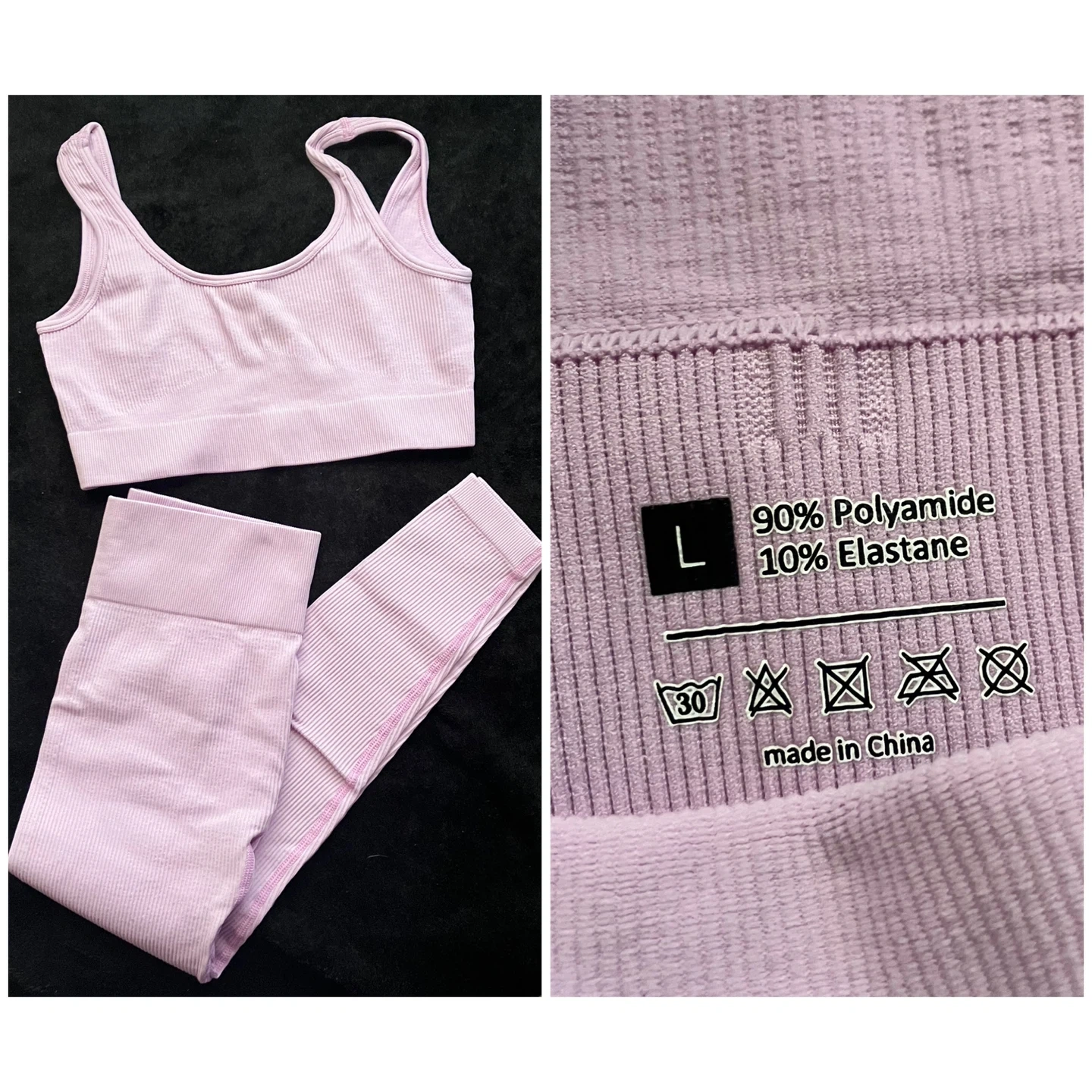 Hi, I'm selling a lilac ribbed activewear set in size large. The material consists of 90% Polyamide and 10% Elastane, making it perfect for workouts or lounging around! Pick up only. (Located in Scarborough.) Thank you for your interest!