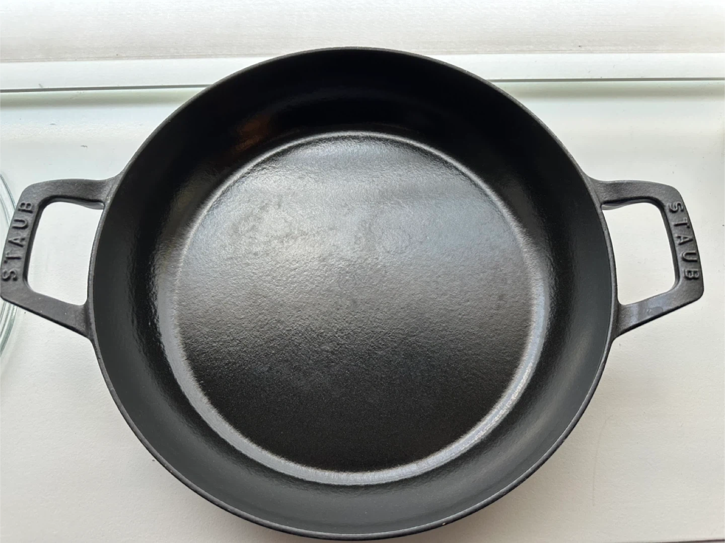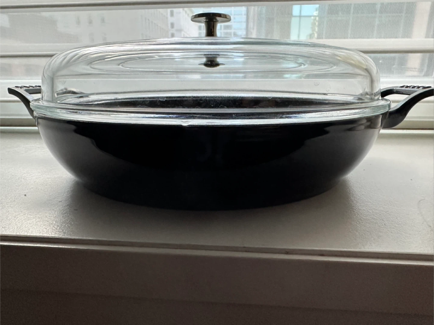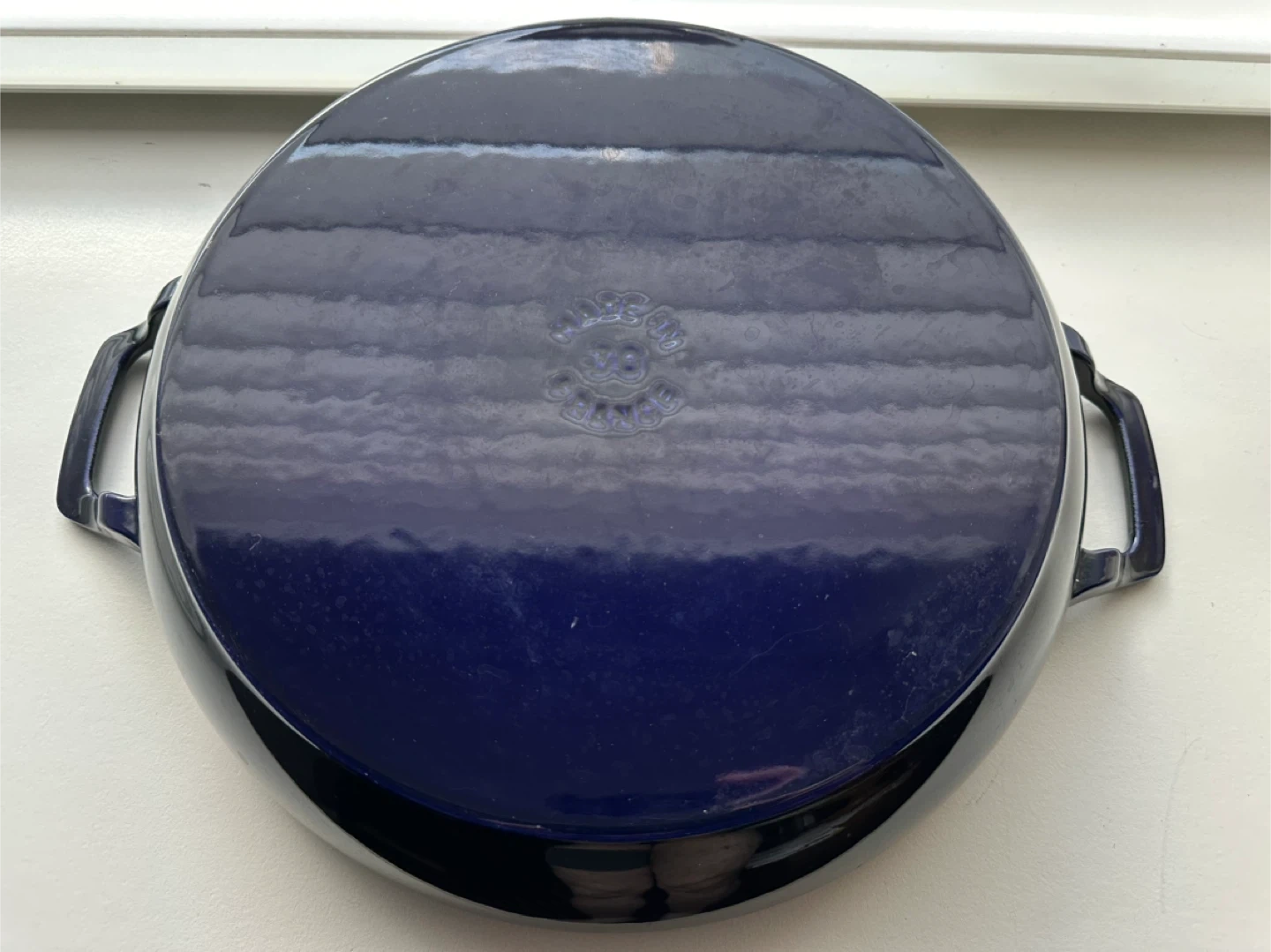 Dark blue matte enameled cast iron braiser from Staub. Heat resistance of 500 degrees F Made in France. Regularly $329.99 plus tax Used only a few times but find it too big and don’t have the room to store it. Net weight: 10.80 lbs Capacity: 3.59 qt Length of product: 15.28 in Width of product: 11.81 in Height of product: 5.31 in Height without lid: 3.03 in Upper diameter: 11.81 in Bottom diameter: 10.12 in Handle length: 1.73 in