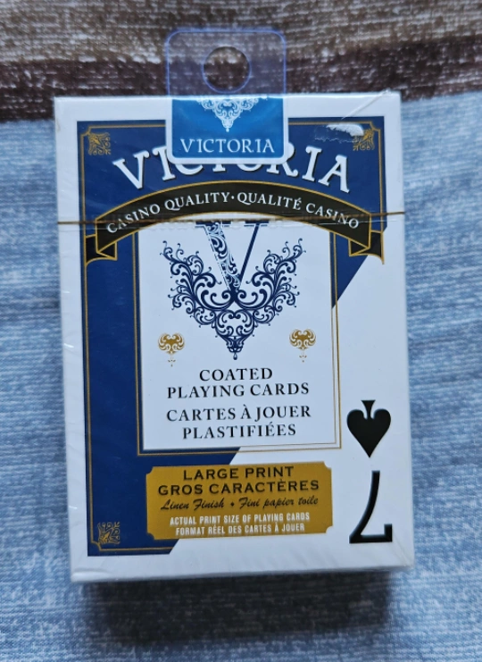 Selling a brand new deck of Victoria casino quality playing cards! These are coated and plastified for durability. The cards also feature a large print, making them easy to read. Perfect for your next game night!