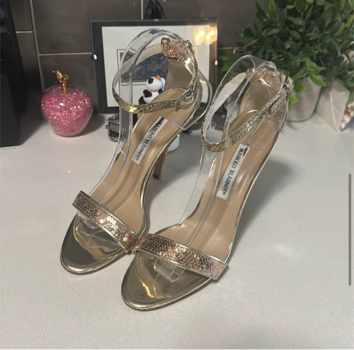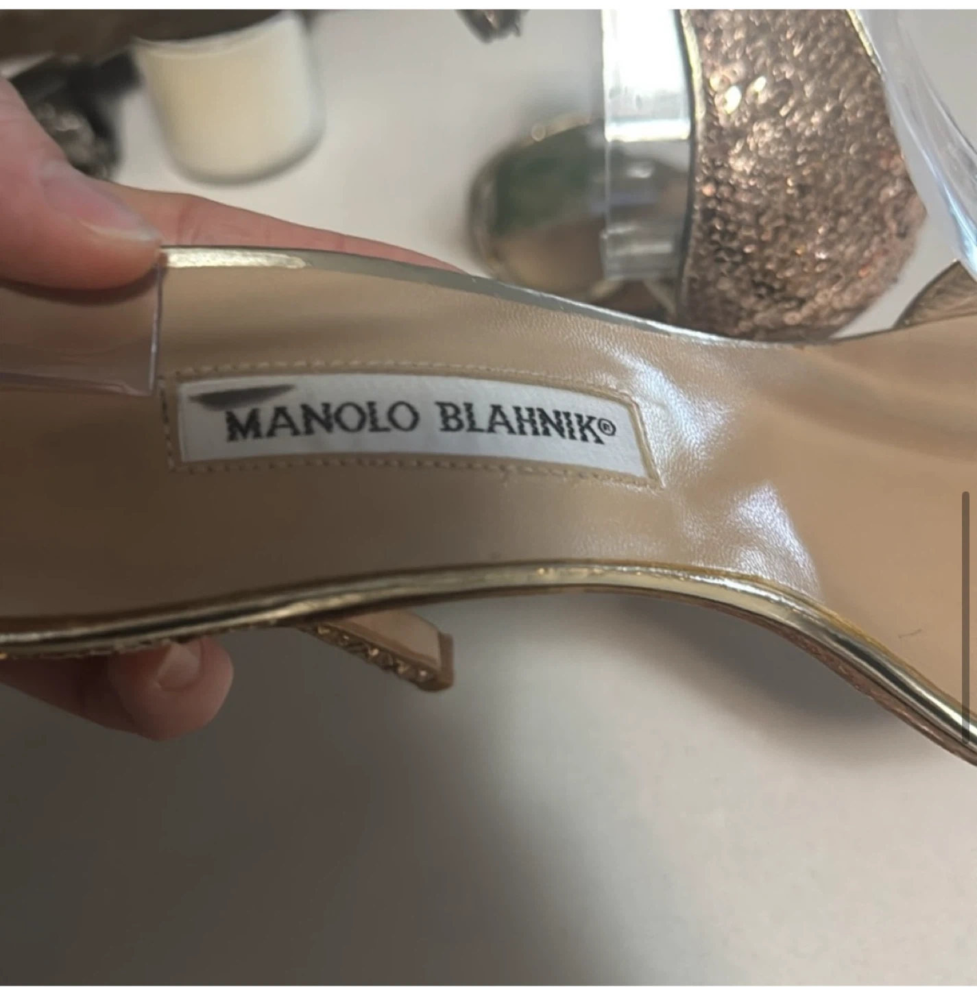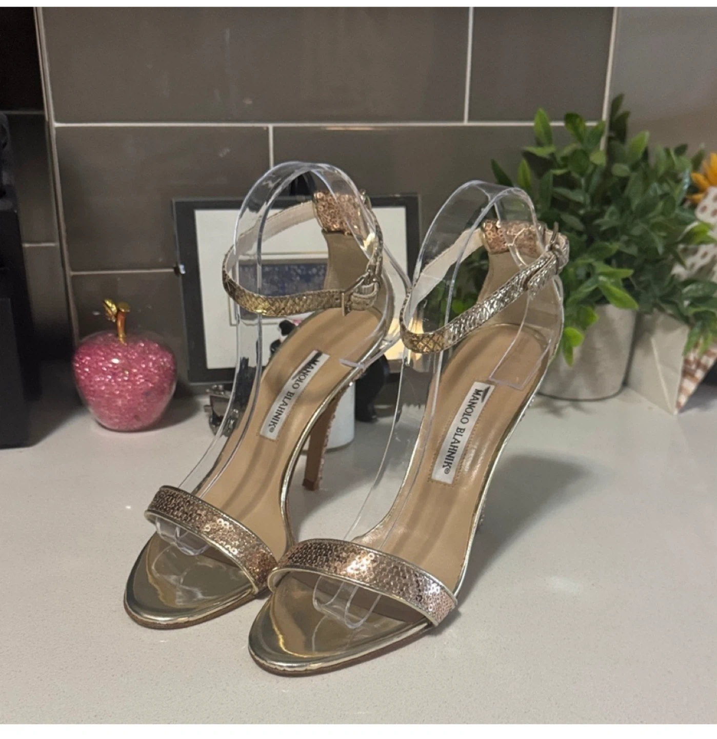 Manolo blahnik gold sequin heels - size 39 (as is strap) Almost like new except minor rubbing at strap and wear to soles. Unsure if straps original as seem off. Great for weddings & holidays. No box. Authentic except maybe straps were replaced. Reposhing this item. Price reflects straps issue Heel height 4”