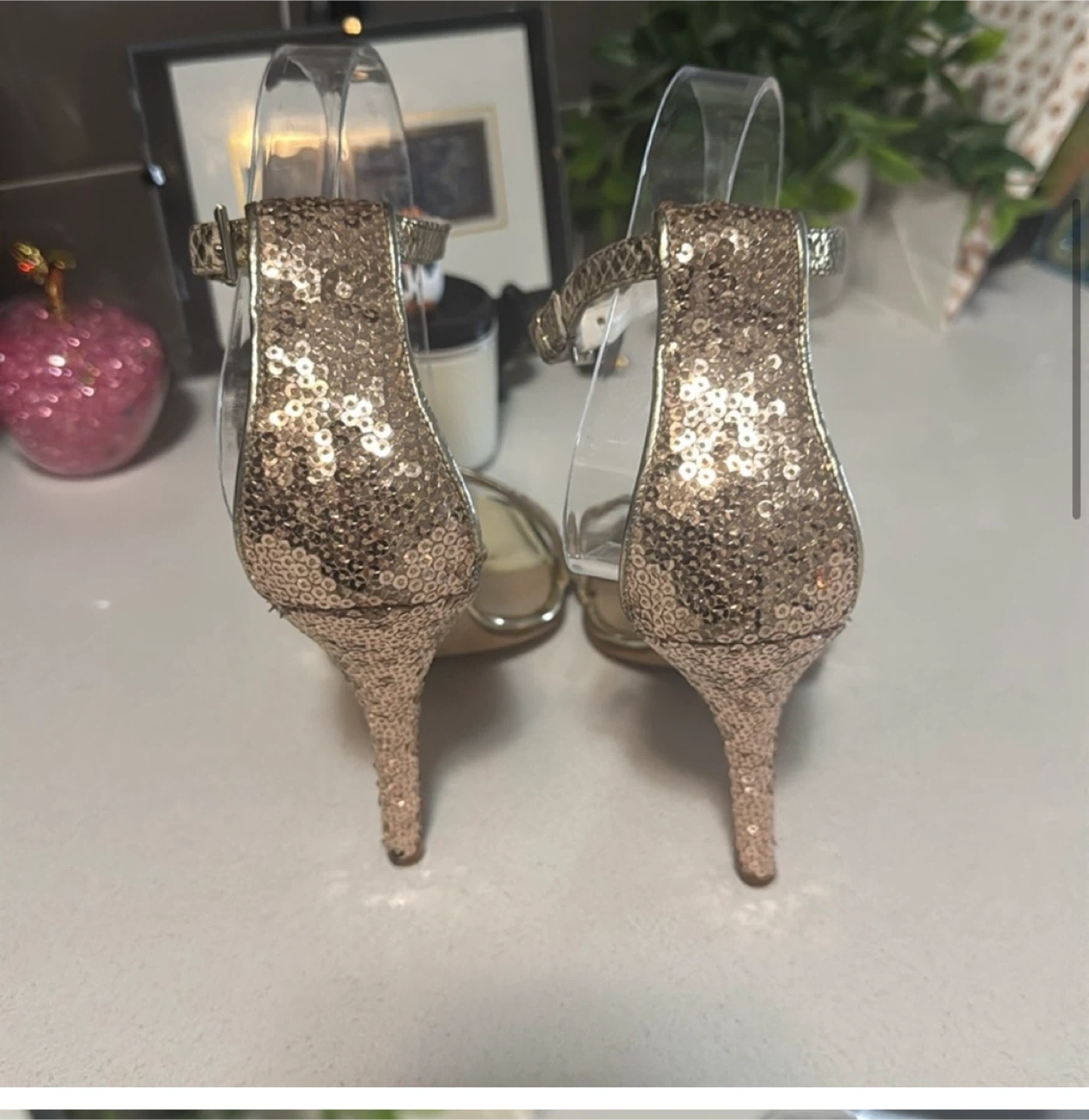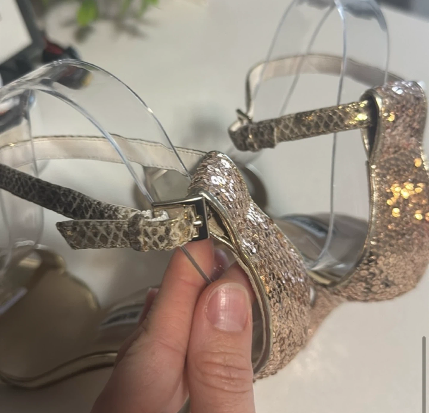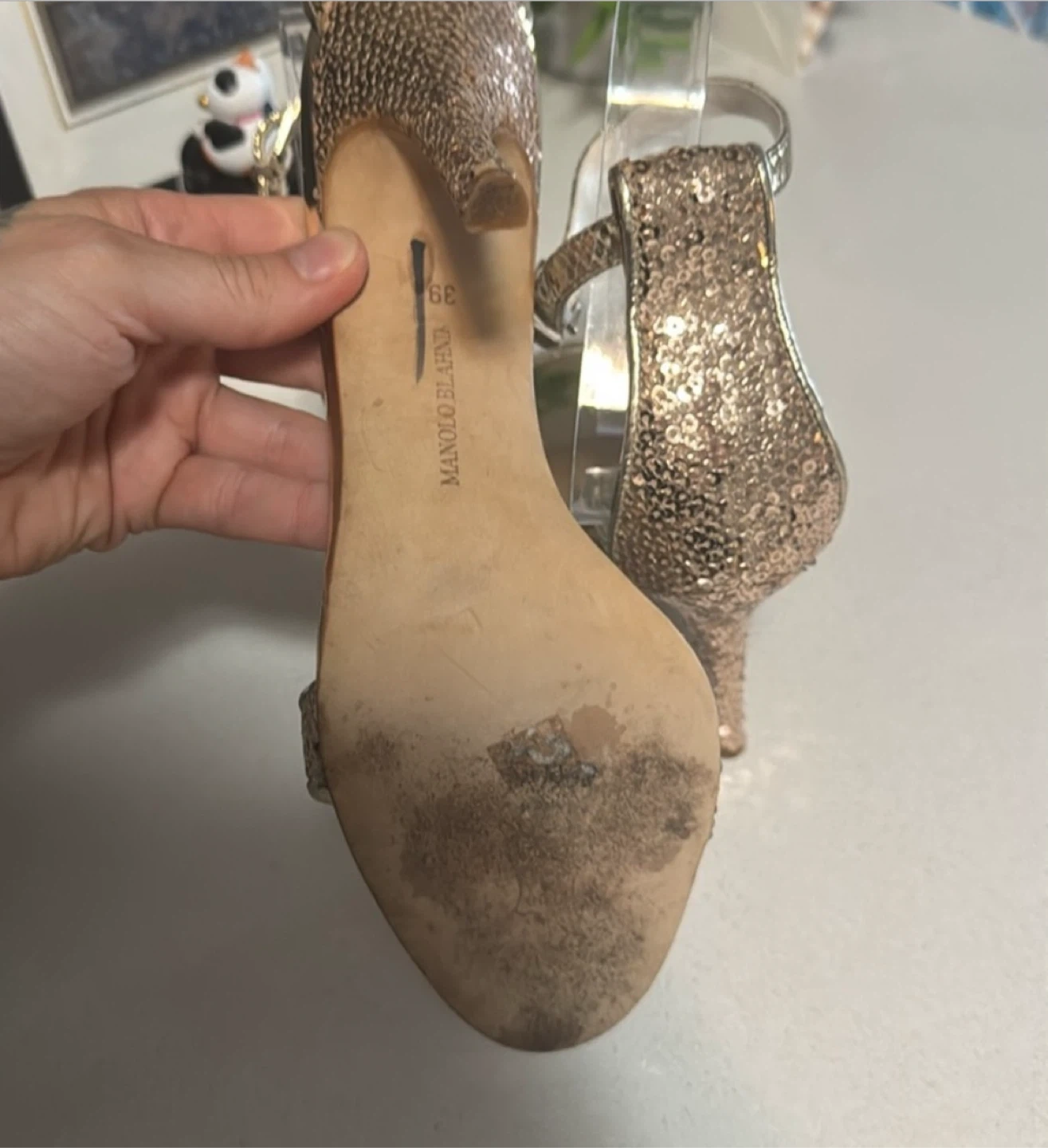Manolo blahnik gold sequin heels - size 39 (as is strap) Almost like new except minor rubbing at strap and wear to soles. Unsure if straps original as seem off. Great for weddings & holidays. No box. Authentic except maybe straps were replaced. Reposhing this item. Price reflects straps issue Heel height 4”