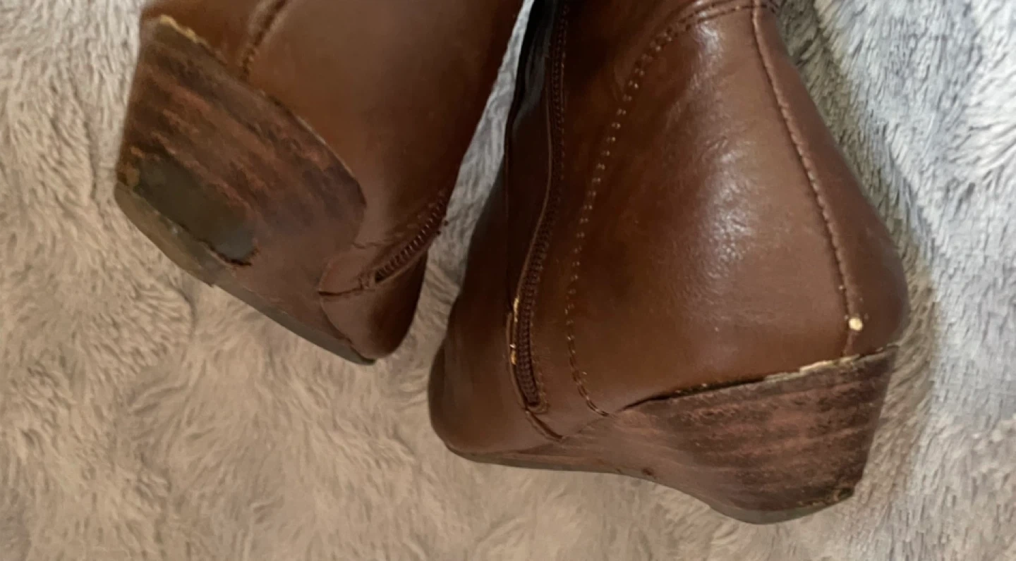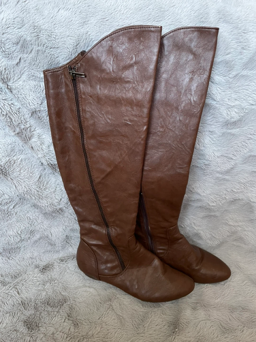 Giving away brown knee-high wedge boots. They have a zipper on the side. They show some signs of wear. Heel on one boot may require some glue.