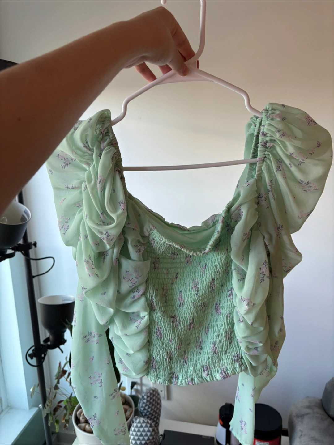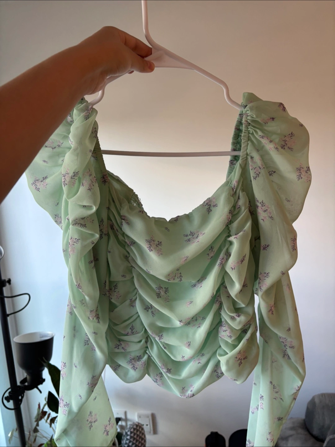 114Here's a cute floral ruched top in a light green colour! It's a size small and features a flattering ruched design.