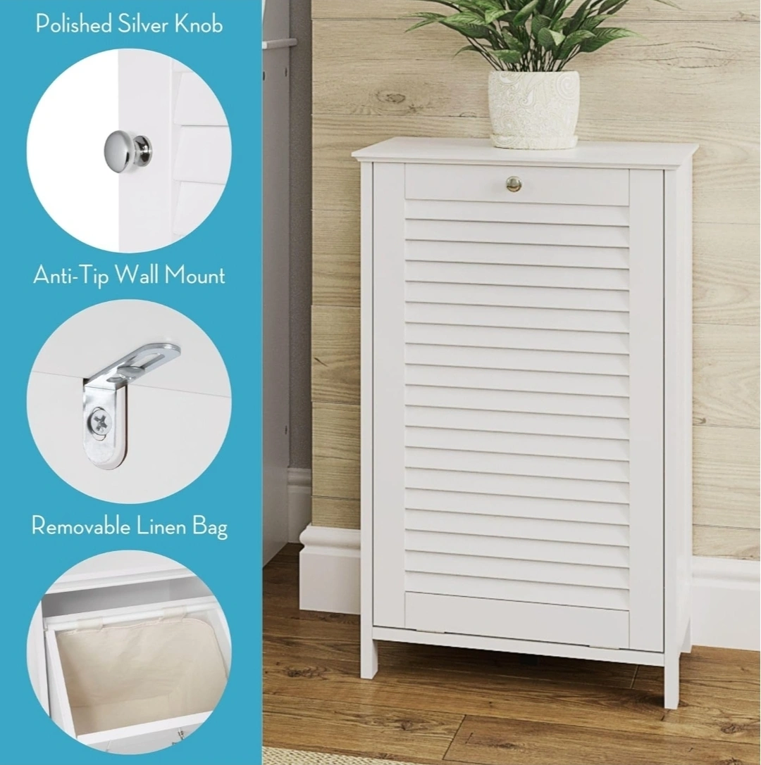 Our Ellsworth Tilt Out Laundry Hamper seamlessly blends functionality and timeless design. Its traditional shutter door with a polished silver knob and white painted finish adds a touch of elegance to any room. The removable interior cloth hamper bag ensures easy transfer of laundry to the washer, while the tilt-out cabinet door provides effortless access.
