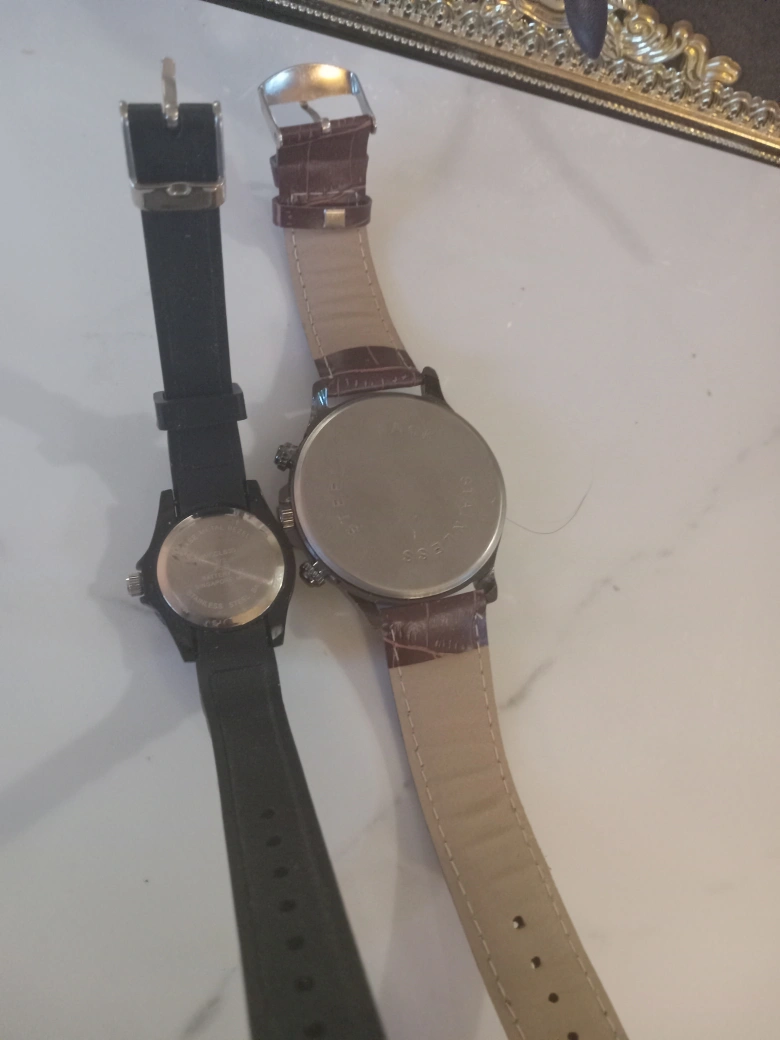 405Selling two wristwatches together. One is black with a rubber strap, and the other has a brown faux-leather band. Both show some signs of wear but are still functional
