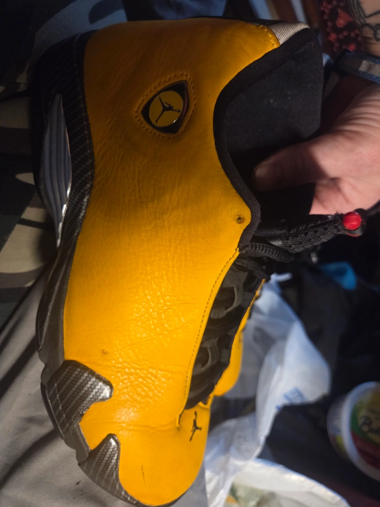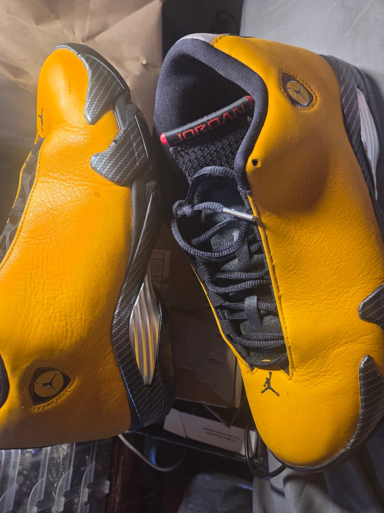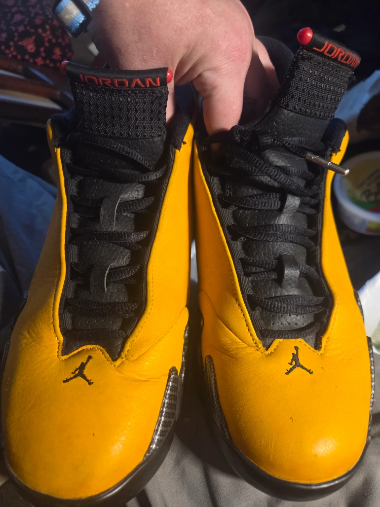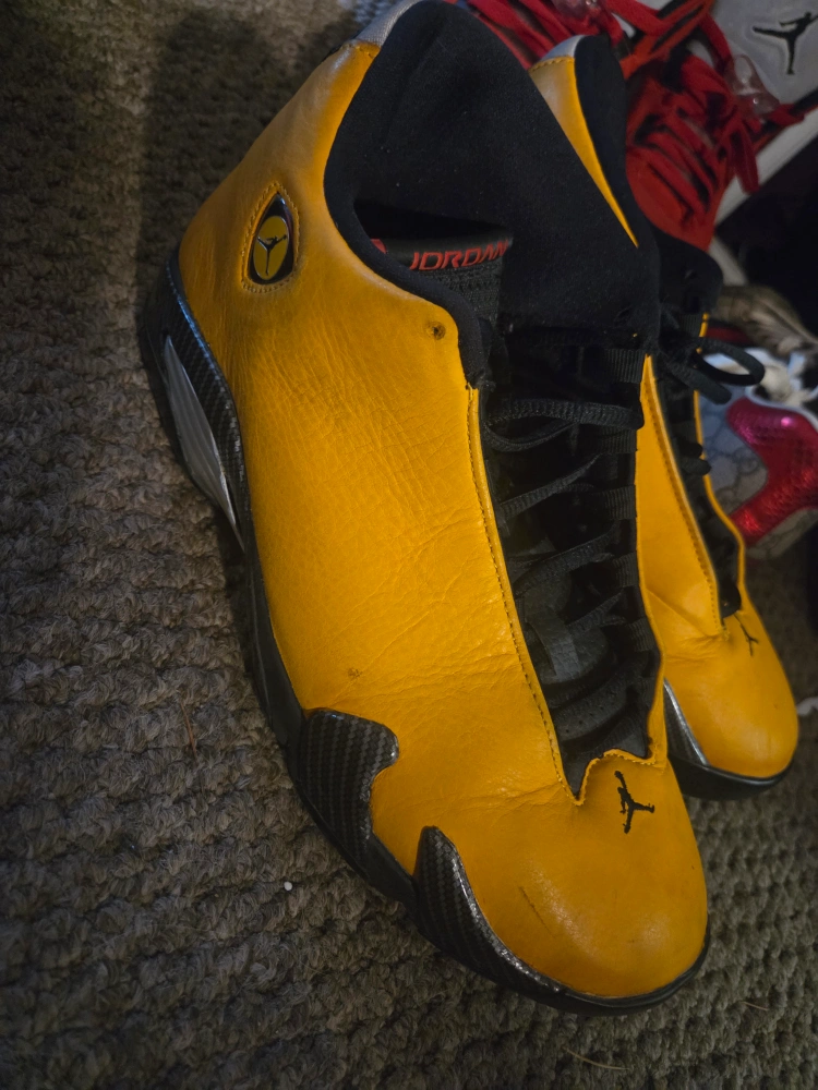 **Raising $ to pay for my daughter dogs vet bill puppy training and registration ** Selling a pair of Air Jordan 14 Retro sneakers in the 'Yellow Ferrari' colourway! These shoes feature a vibrant yellow leather upper with black accents and carbon fibre detailing. They're in good condition, perfect for adding a pop of colour to your sneaker collection