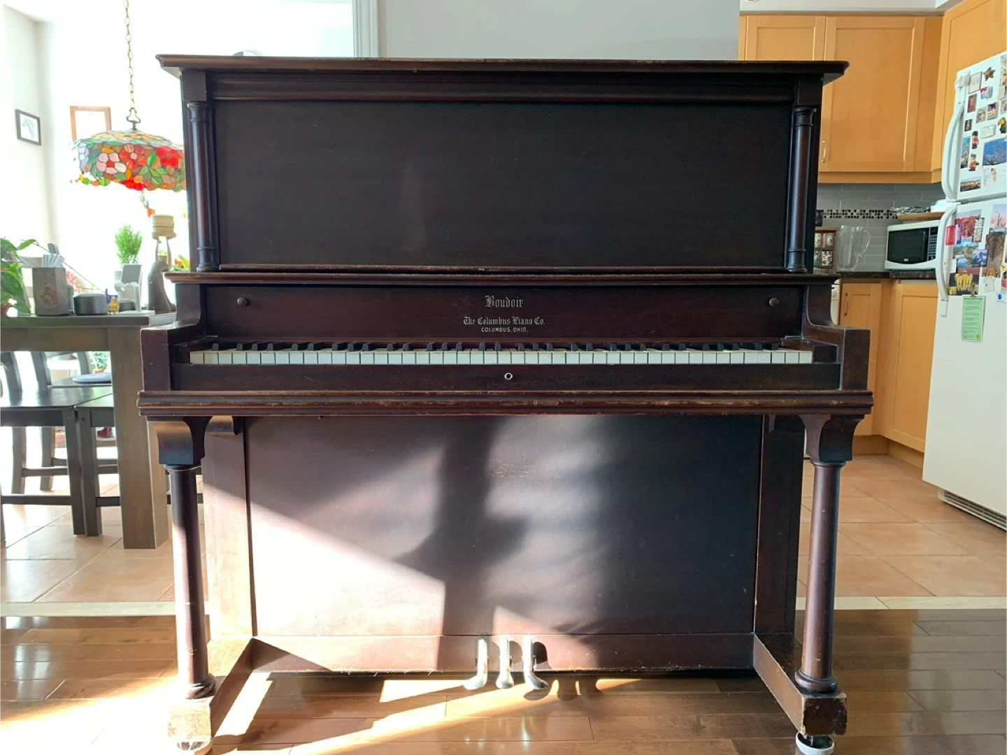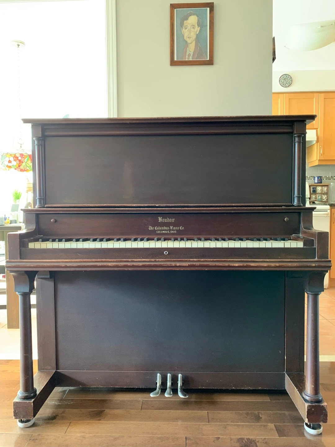 Selling a Boudoir piano from The Columbus Piano Co. It's a beautiful piece! The piano is in good condition for its age, with some wear and tear as shown in the photos. It would be great for someone looking for a vintage instrument.