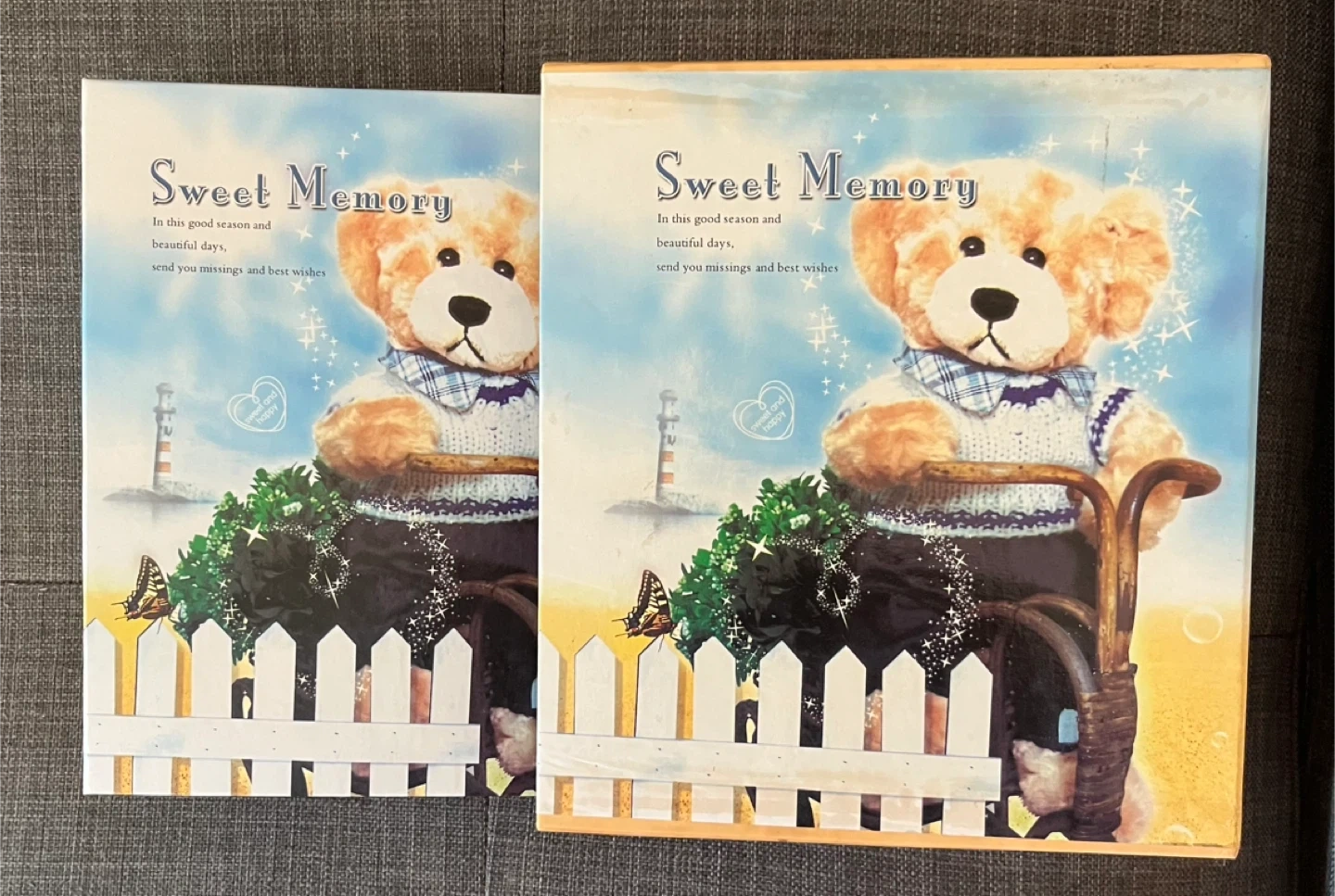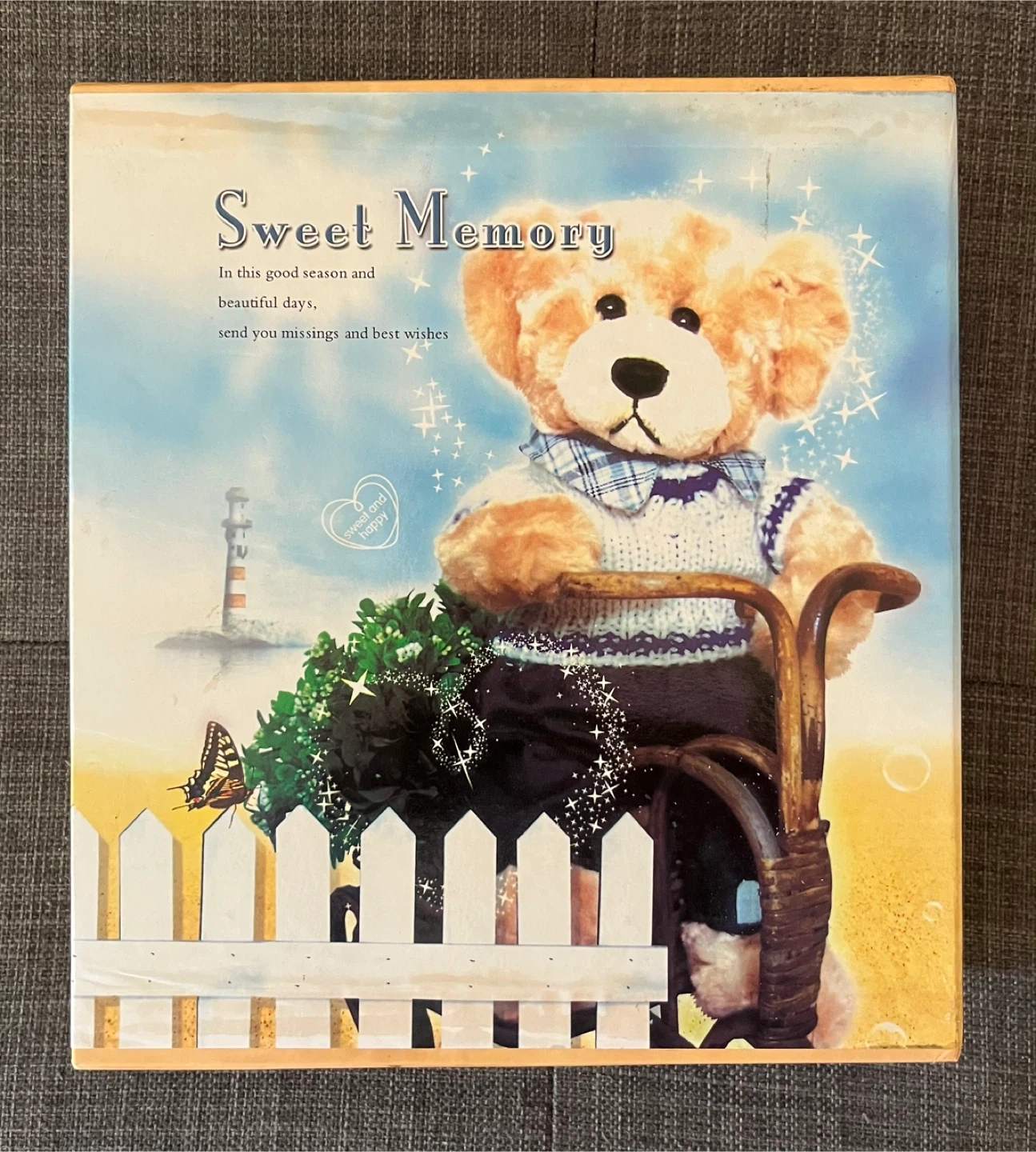 A cute photo album with a teddy bear design on the cover. It's called 'Sweet Memory' and has a lovely picture of a teddy bear on a tricycle. The album is new and in a great shape and ready to hold your precious memories.