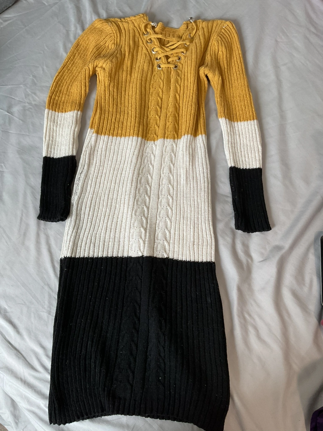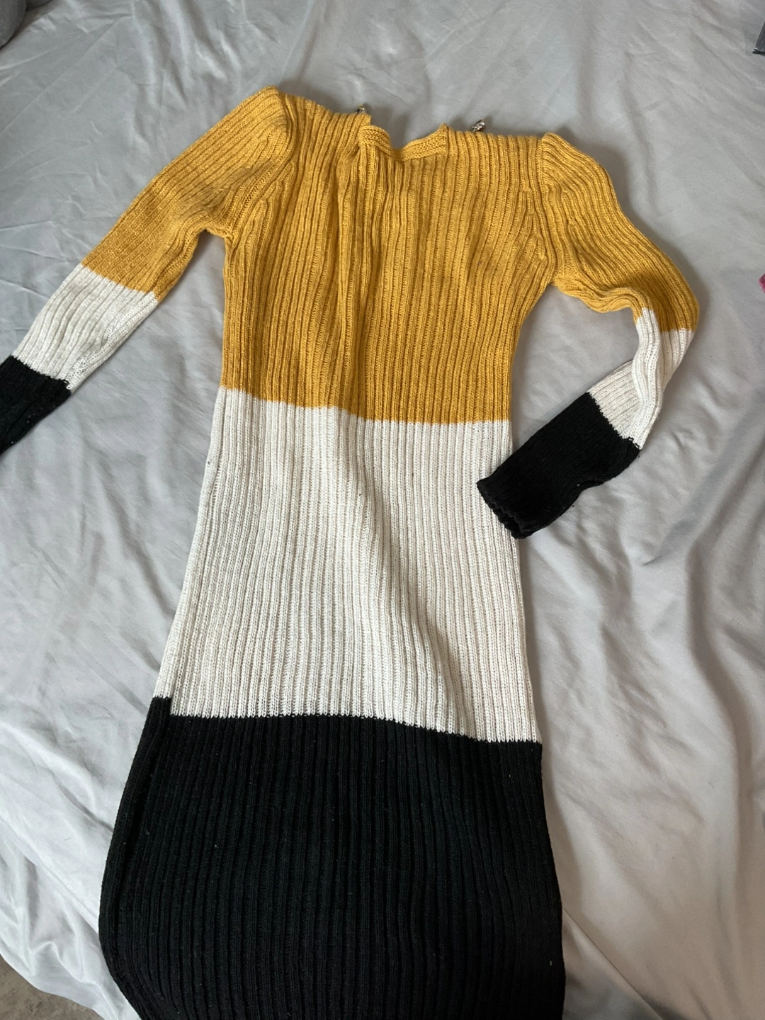 Cozy colour block knit dress in yellow, white, and black. It's a stylish and comfortable piece, perfect for adding a pop of colour to your wardrobe. The knit material makes it ideal for cooler weather