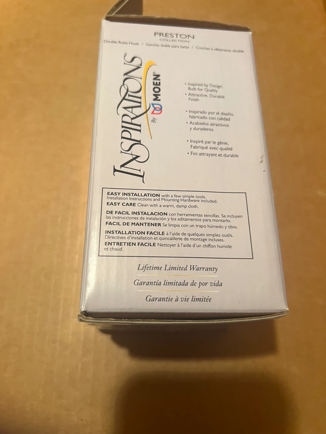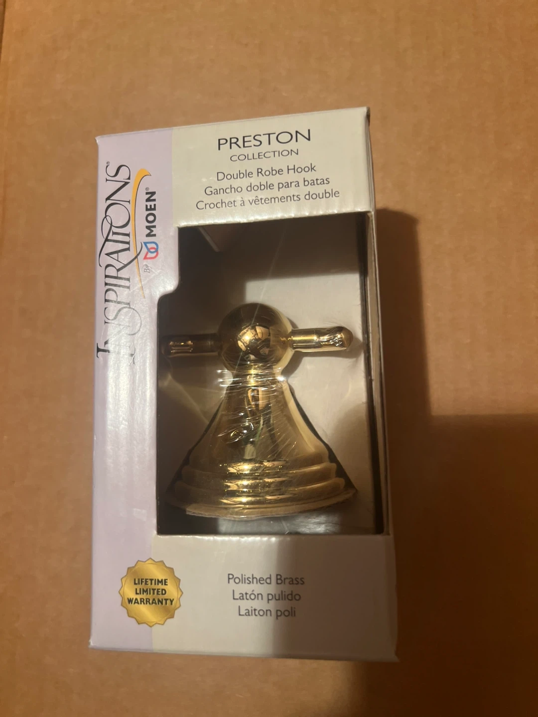 Selling a Moen Preston Collection double robe hook in polished brass. It's brand new, still in the box and sealed packaging. Easy to install with a few simple tools and included mounting hardware. It's also easy to clean with a damp cloth. Attractive and durable finish makes it a great addition to any bathroom or bedroom.
