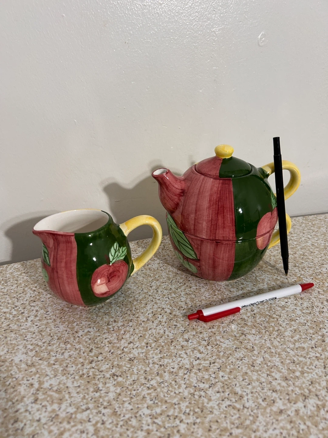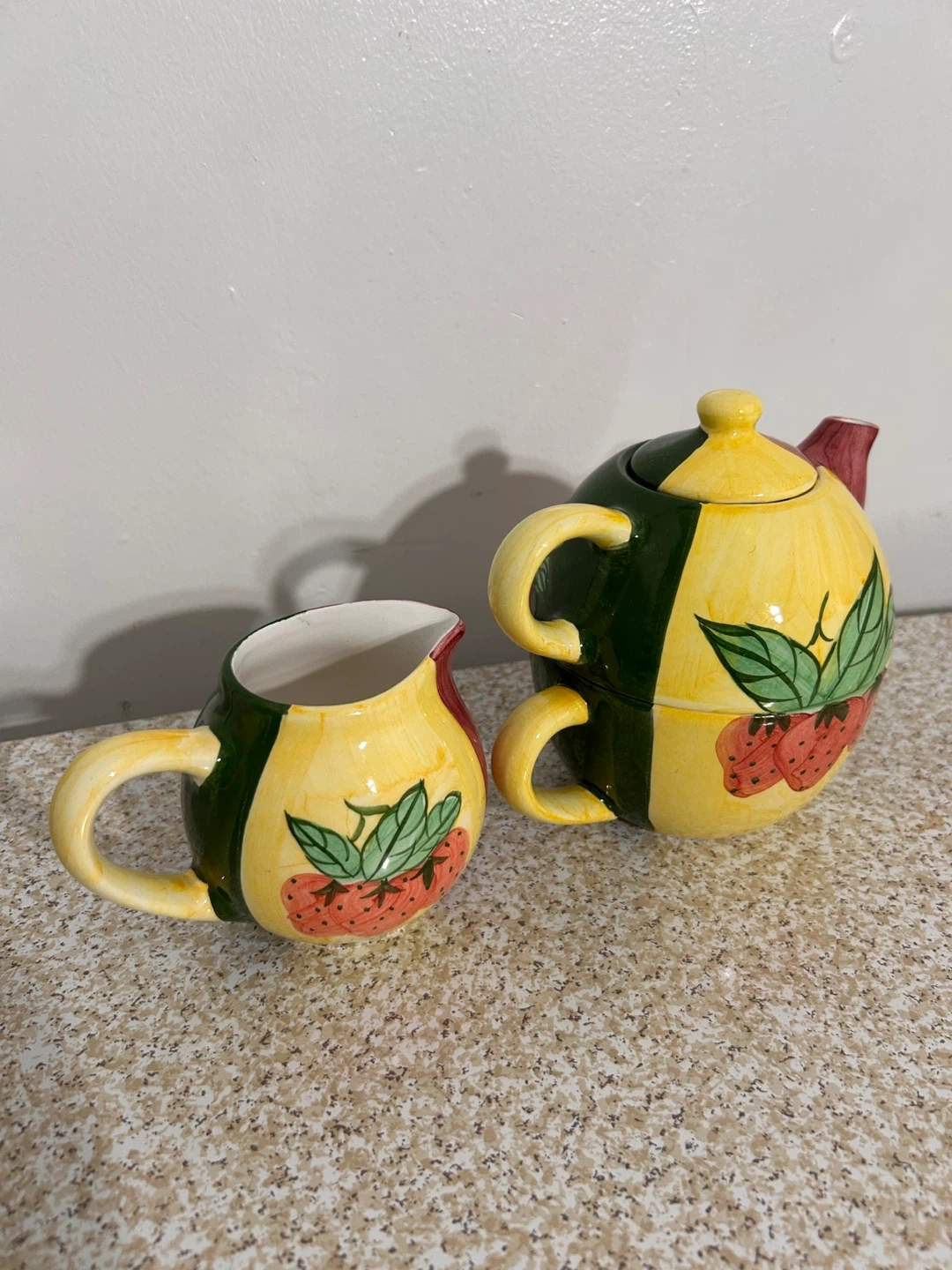 Selling a cute vintage ceramic teapot and creamer set! It has a unique design with strawberries and apples. Perfect for adding a touch of retro charm to your kitchen or tea parties