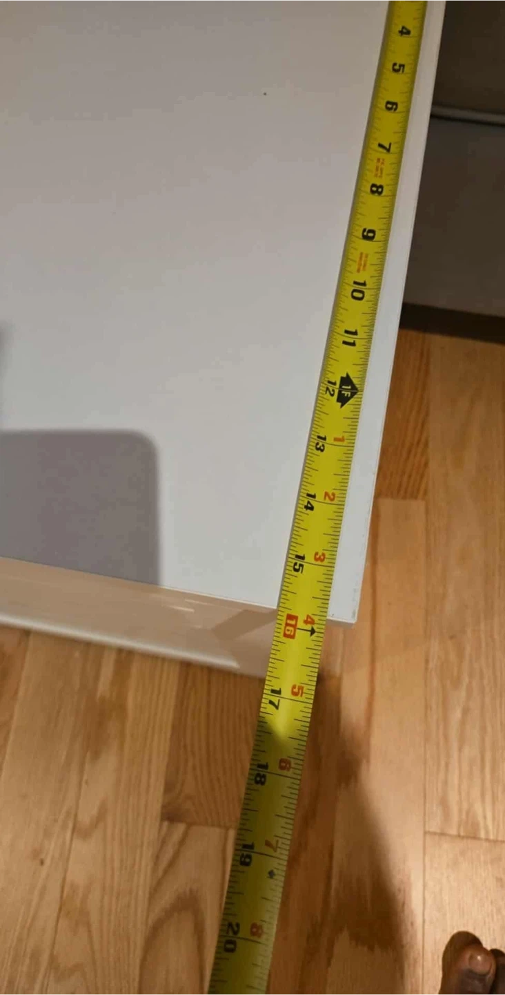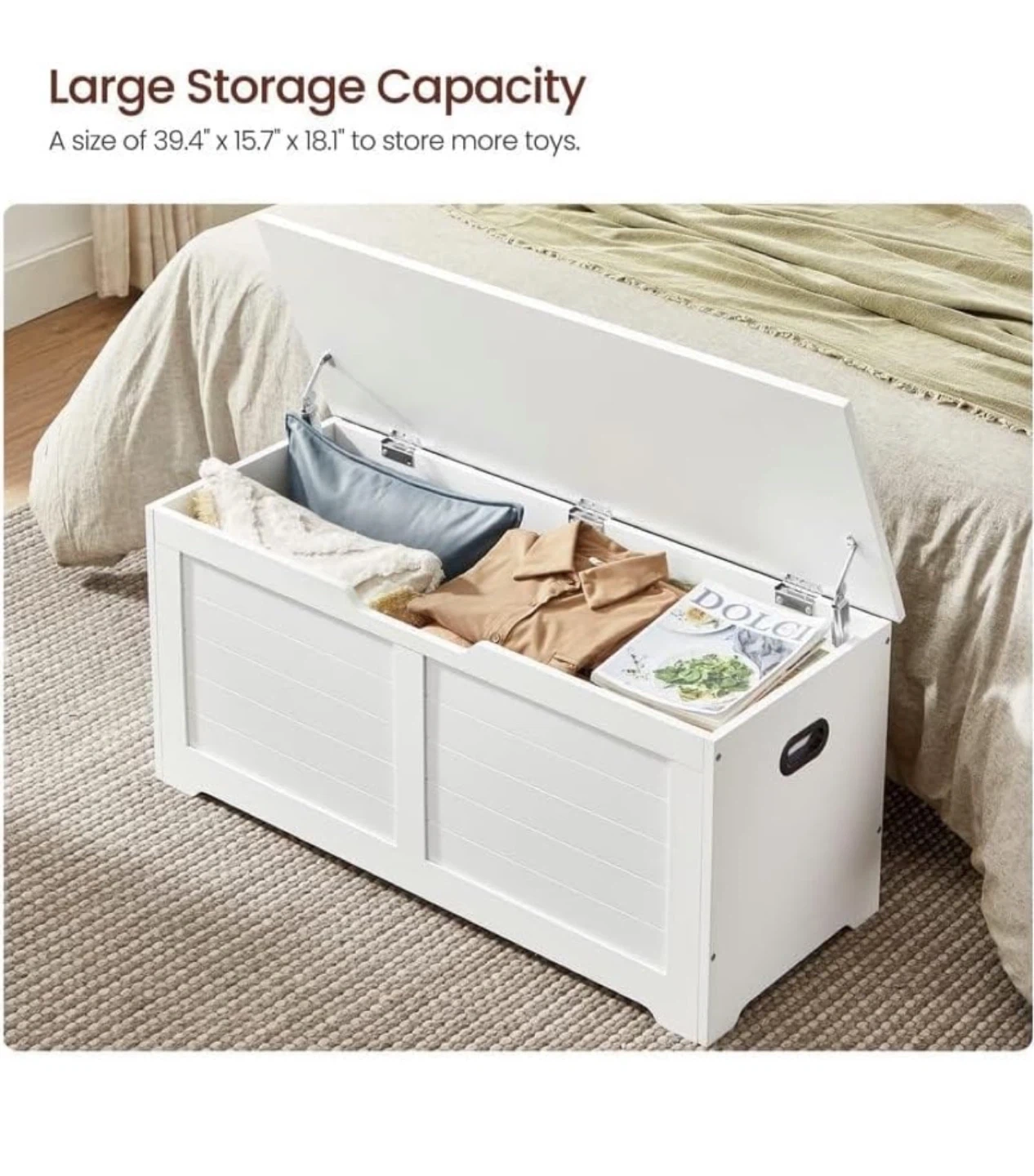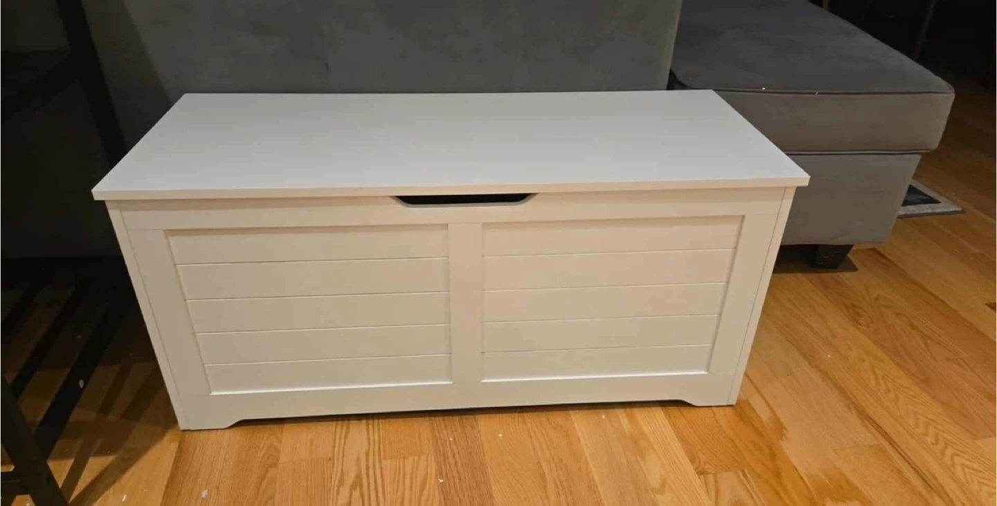 I'm selling a white wood storage bench. It features a safe lid that stays open at 60 degrees or lower and closes when there are 2 inches of space left. The dimensions are approximately 39.4" x 15.7" x 18.1". Available for pickup and delivery