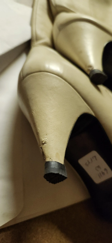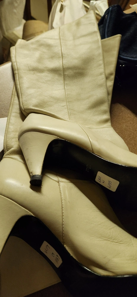 These are a pair of beige leather boots in size 6.5. They show some wear, particularly on the heels, as you can see in the photos. Still lots of life left in them!