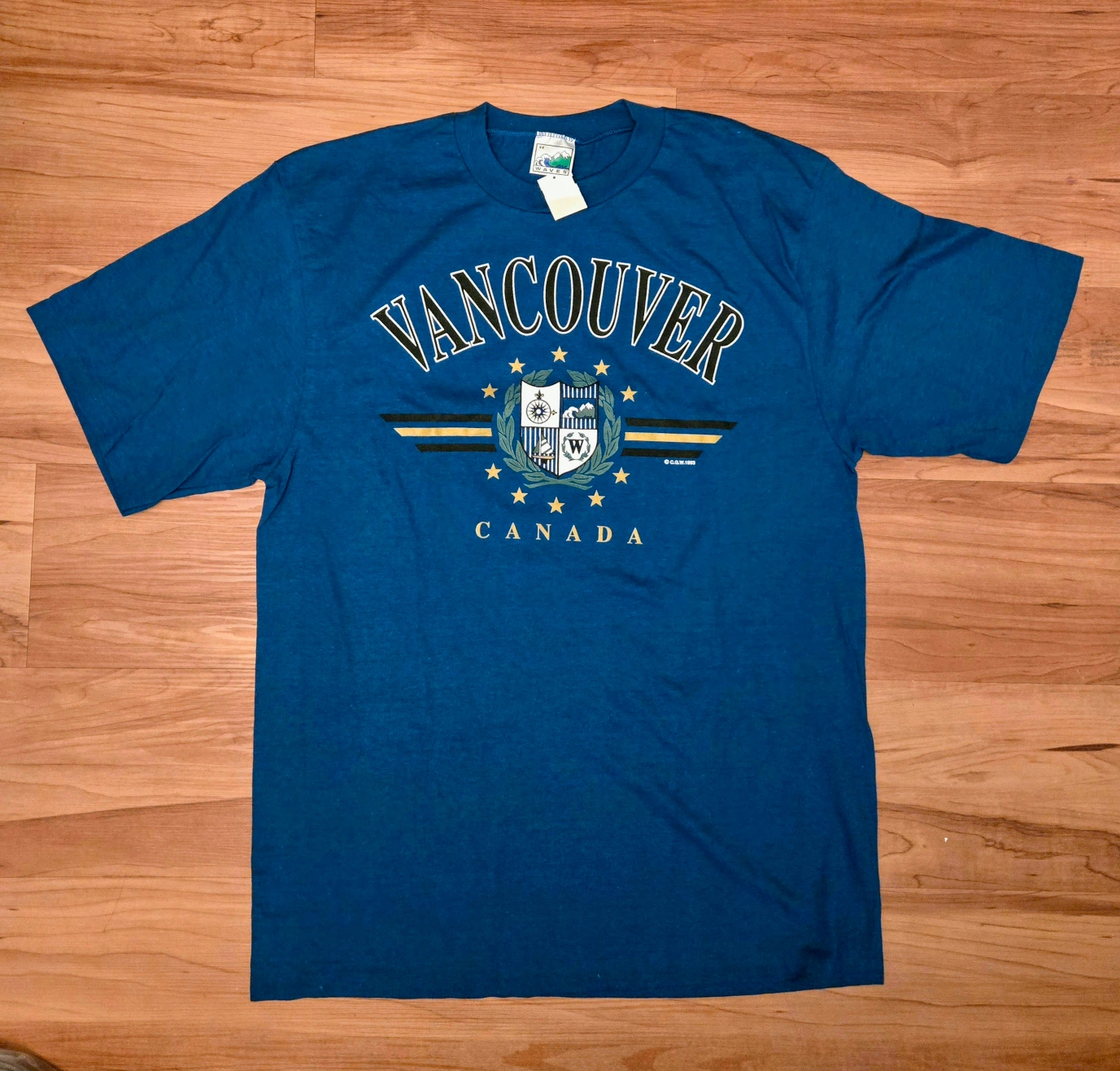 168A true vintage blue T-shirt from the early 90's featuring Vancouver, Canada design. Perfect for showing off your Canadian pride or as a souvenir from your trip to Vancouver! - brand new with tags - 100% cotton, excellent vintage quality fabric and fit! - Size M, unisex - made in Canada π¨π¦ - can also meet in Fairview ββ My family had a Tshirt Business in the 80's & early 90's. This is left over stock. Check my page often for LOTS more Adult's & Children's Tshirts to come! ββ
