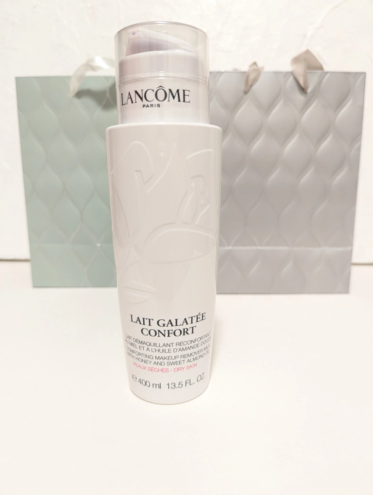 I'm selling a bottle of Lancôme Lait Galatée Confort. It's a comforting makeup remover milk with honey and sweet almond oil, perfect for dry skin. The bottle contains 400ml / 13.5 fl oz