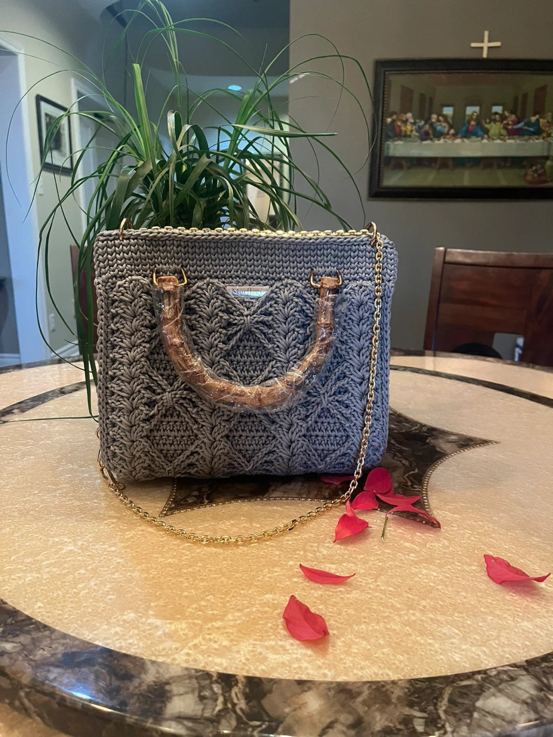 Check out this unique handmade knitted purse! It features a stylish grey knit design and a distinctive bamboo handle. The purse also has a gold chain strap, adding a touch of elegance. It's in great condition and ready for a new home