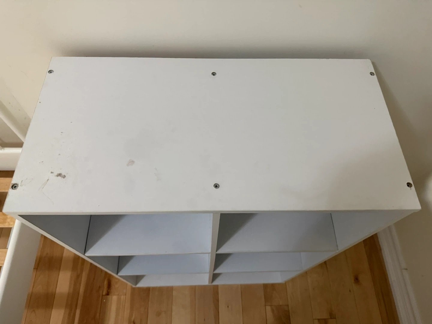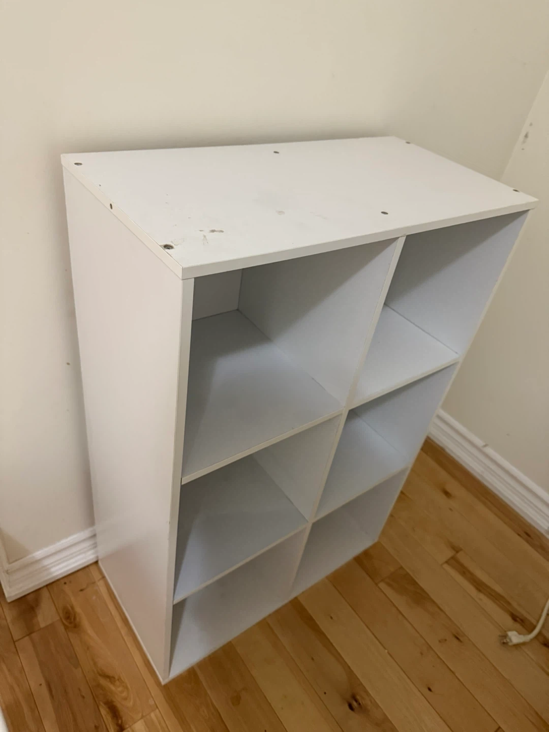 Selling a white 6-Cube storage organizer - bookshelf. It's perfect for organizing books, toys, or other items. It is in good condition with some signs of use on the top surface as shown in the pictures.
