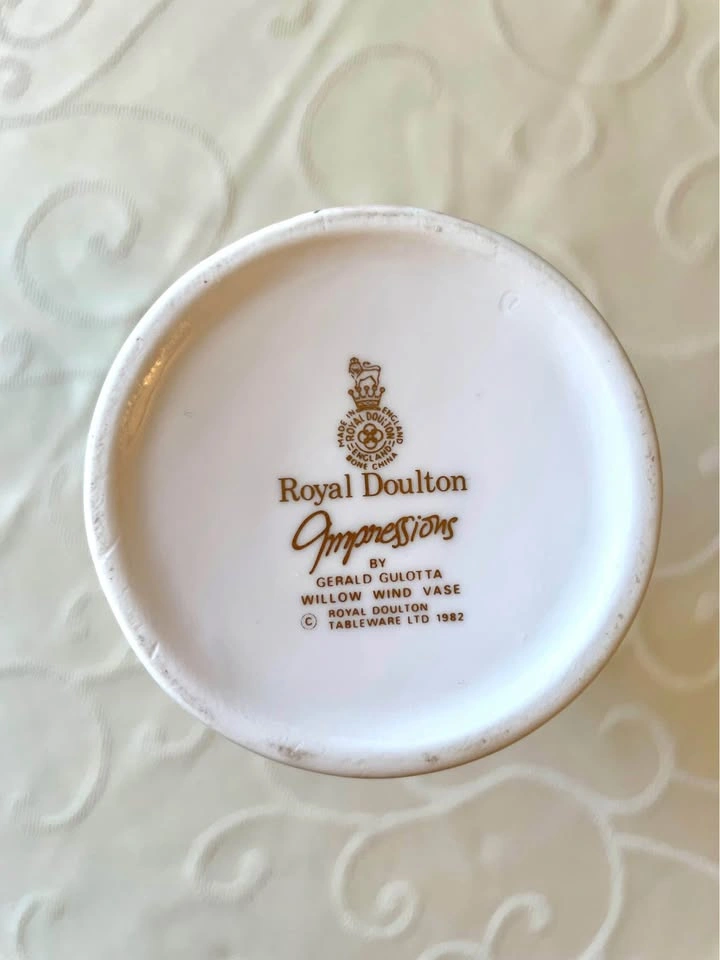 Selling a vintage Royal Doulton Willow Wind Bud Vase from the Impressions series by Gerald Gulotta. This bone china piece was manufactured in England in 1982 by Royal Doulton, a well-known brand known for its high-quality. With its unique design and limited manufacture time period, this bud vase is a highly collectible decorative or useful item for any enthusiast of vintage pieces. It is in excellent condition with no wear, scratches, or chips. The width of the base measures 2 5/8" and the height is 7 1/4". It is approximately 9 1/2" tall. Comes in the original box. Makes a beautiful and useful gift! π Get your Christmas shopping done early and avoid the crowds, higher prices, and cold weather! Asking $25 or make me an offer. Check out my other listings too!