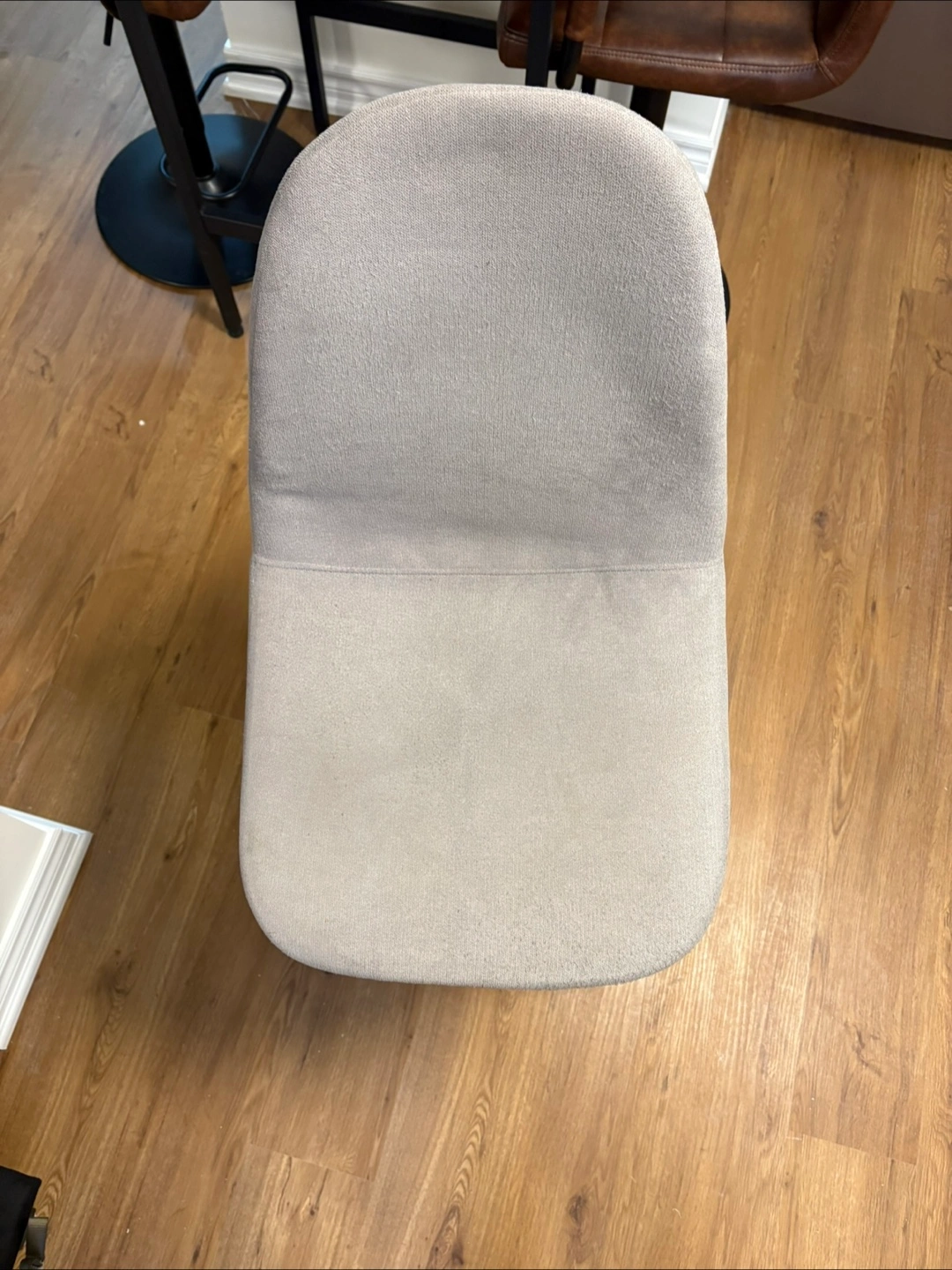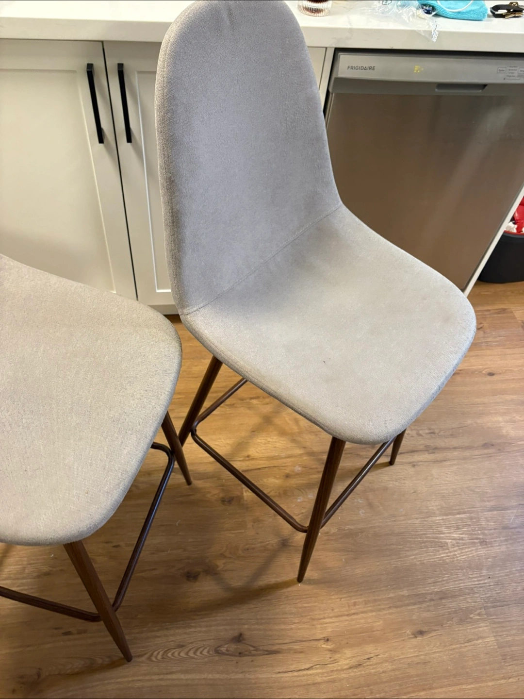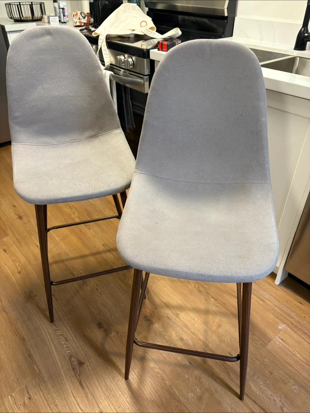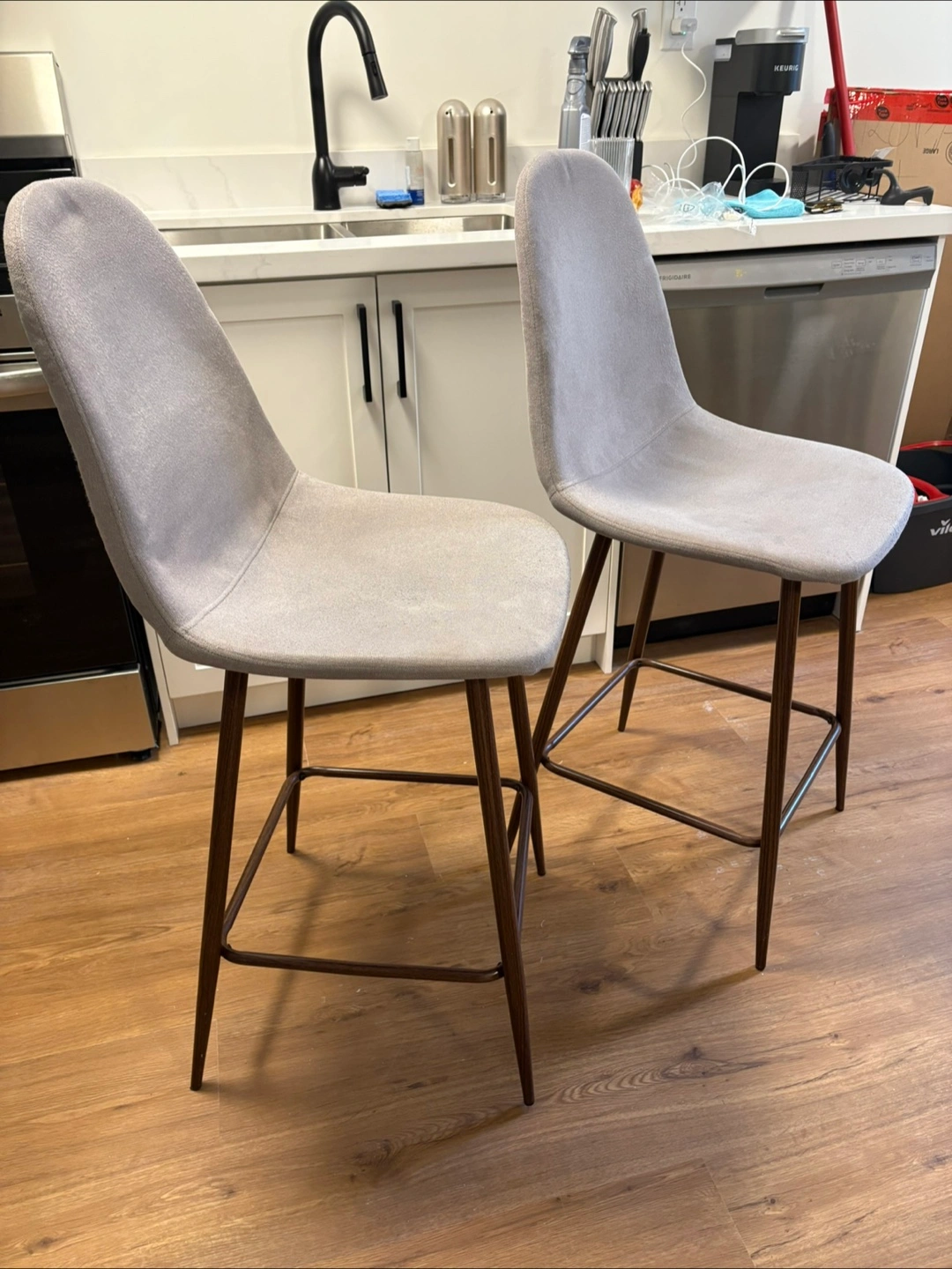 Selling a set of two counter height stools. They feature a comfortable grey seat and a sturdy, dark brown frame. Perfect for adding a modern touch to your kitchen or bar area!