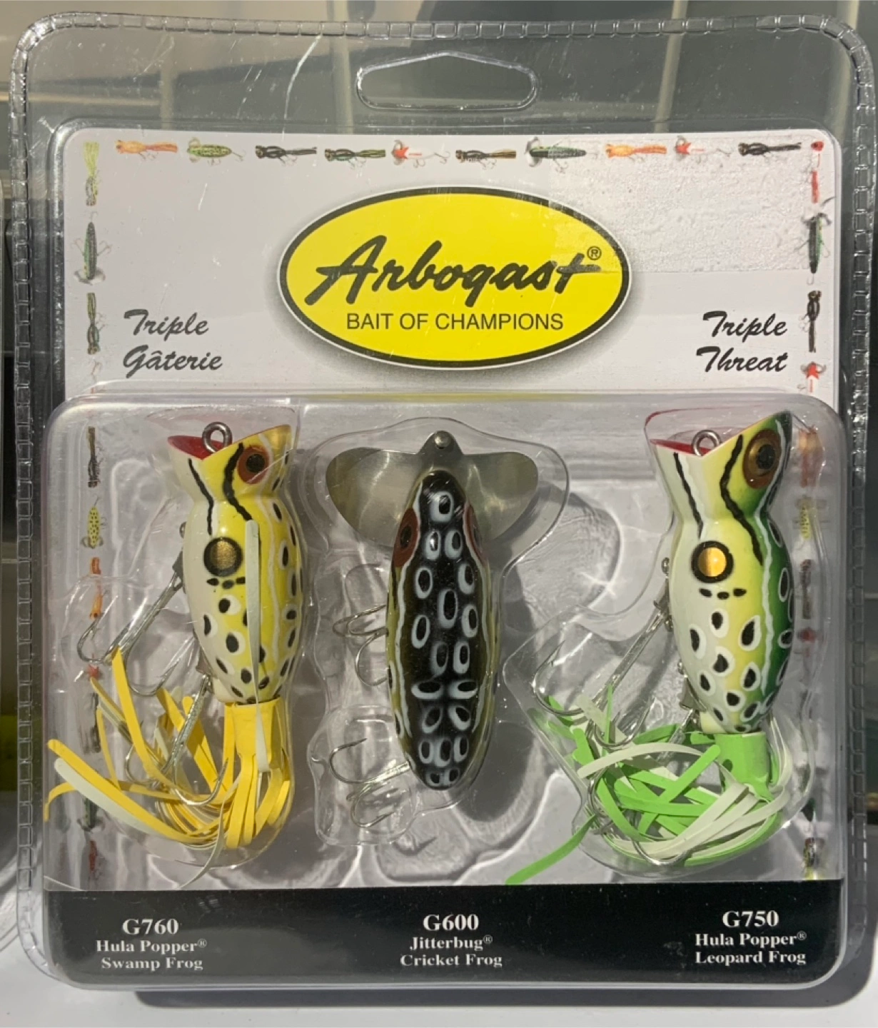 433Arbogast Bait of Champions Triple Threat fishing lure set! It includes the G760 Hula Popper in Swamp Frog, the G600 Jitterbug in Cricket Frog, and the G750 Hula Popper in Leopard Frog.