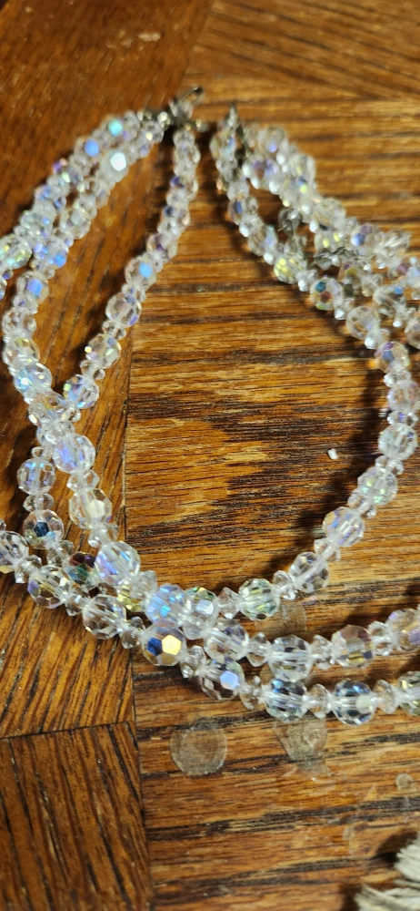 This is a beautiful vintage aurora borealis crystal necklace! It has three strands of sparkling crystals that catch the light beautifully. Perfect for adding a touch of elegance to any outfit