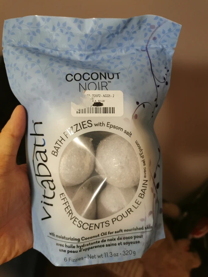 I'm selling a bag of Vitabath Coconut Noir Bath Fizzies with Epsom salt! These bath fizzies contain moisturizing coconut oil for soft, nourished skin. There are 6 fizzies in the bag, with a net weight of 11.3 oz (320g). Originally, this bag was $11 at the store