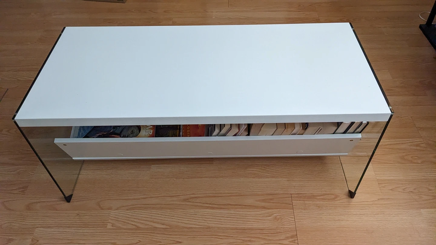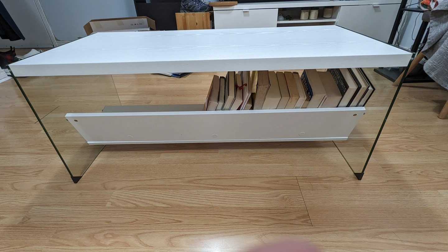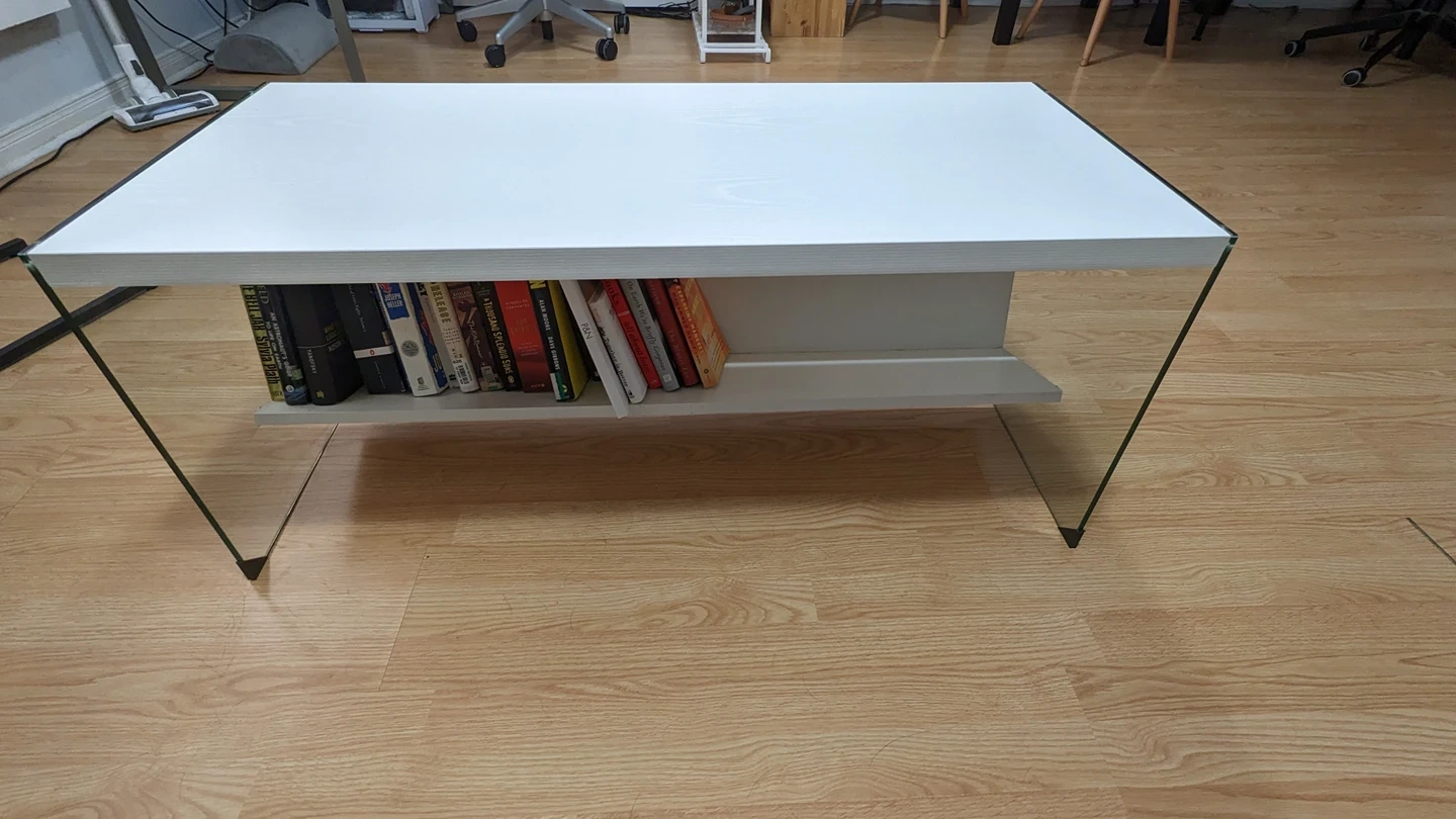 Glass coffee table with shelf (white wood top)