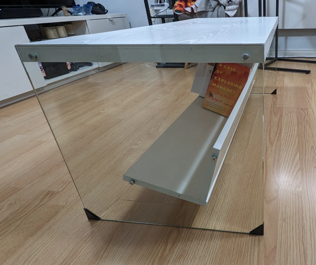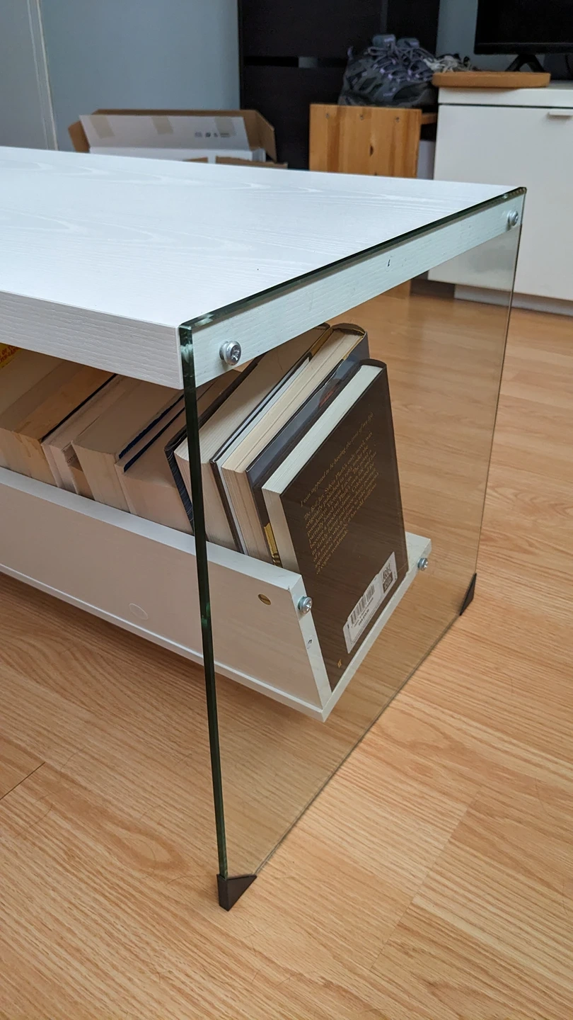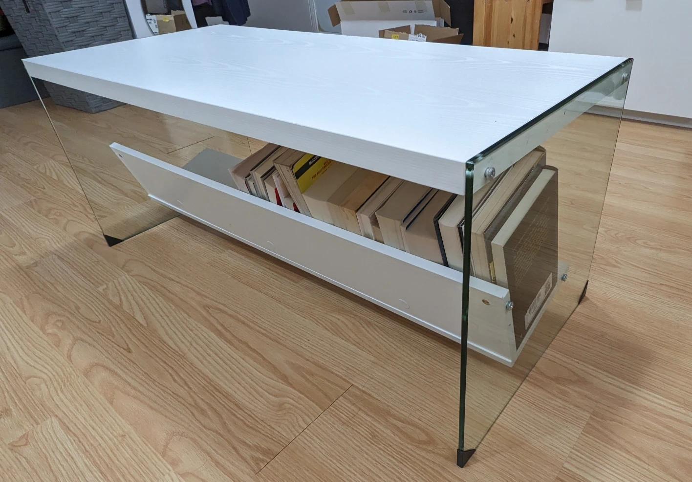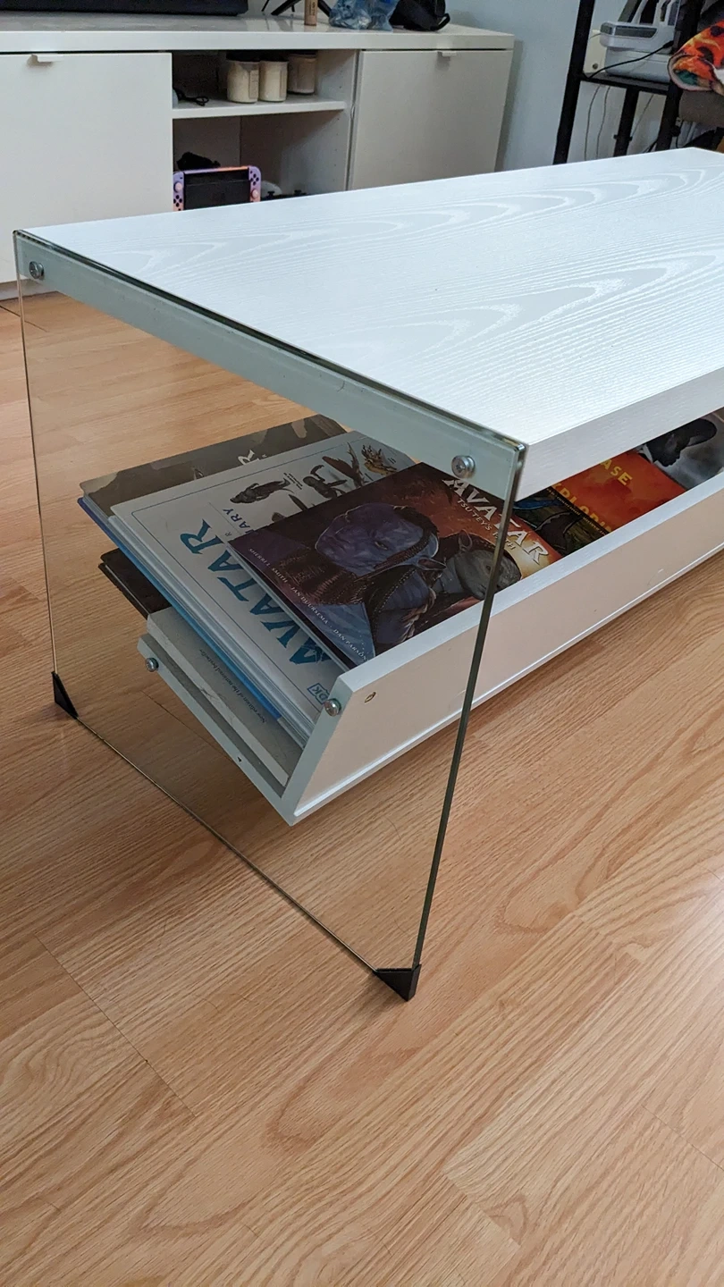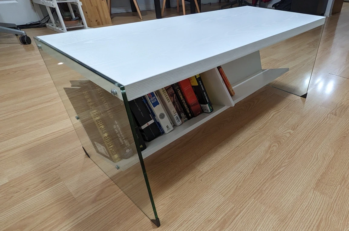 This is a unique and modern looking coffee table with glass sides and white wood top and an angled shelf - perfect for storing books!