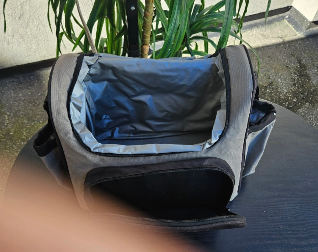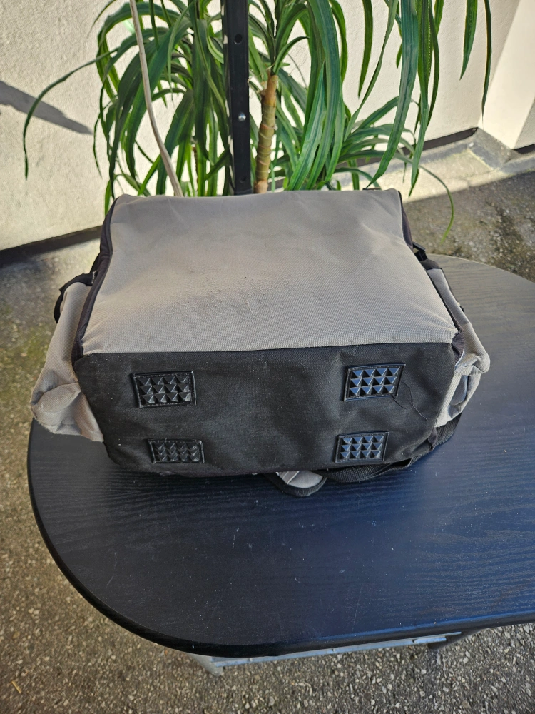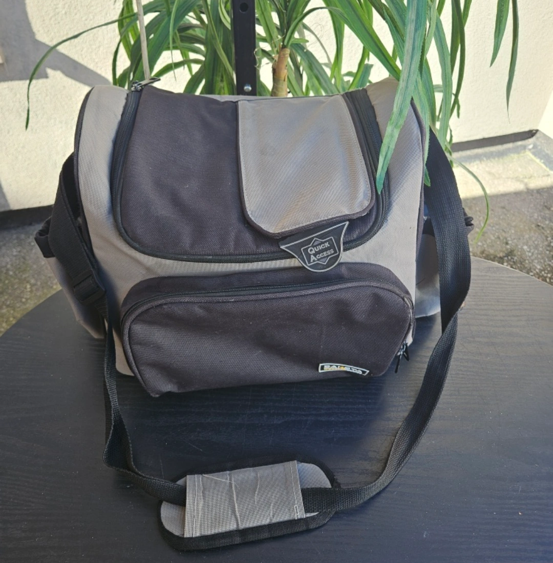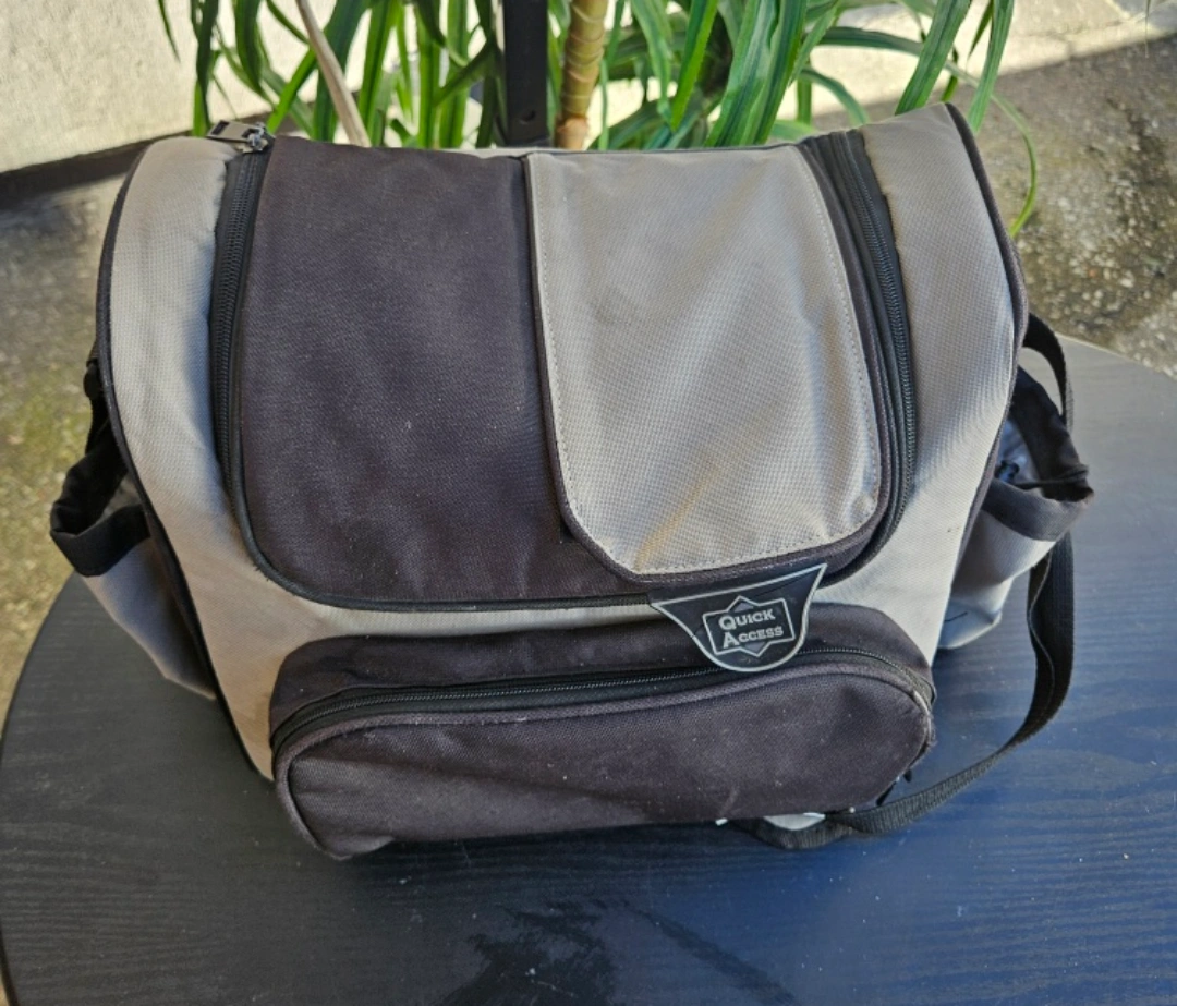 Here's a grey and black bag! It features a 'Quick Access' design, making it super convenient for parents on the go. It's in great shape and ready for a new home!