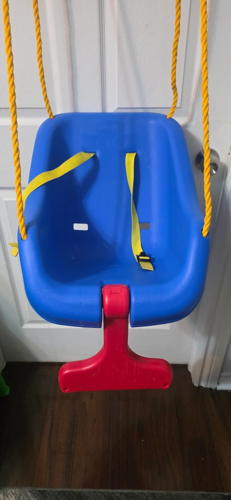 This is a Little Tikes toddler swing in blue and red. It features yellow straps and is perfect for indoor or outdoor use. Your little one will love swinging in this!