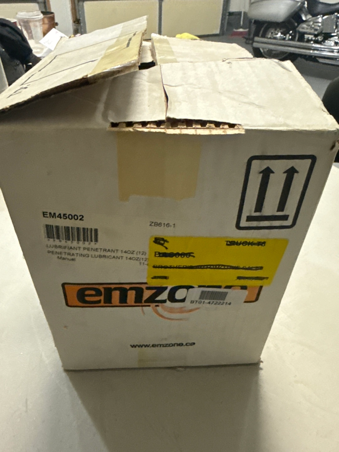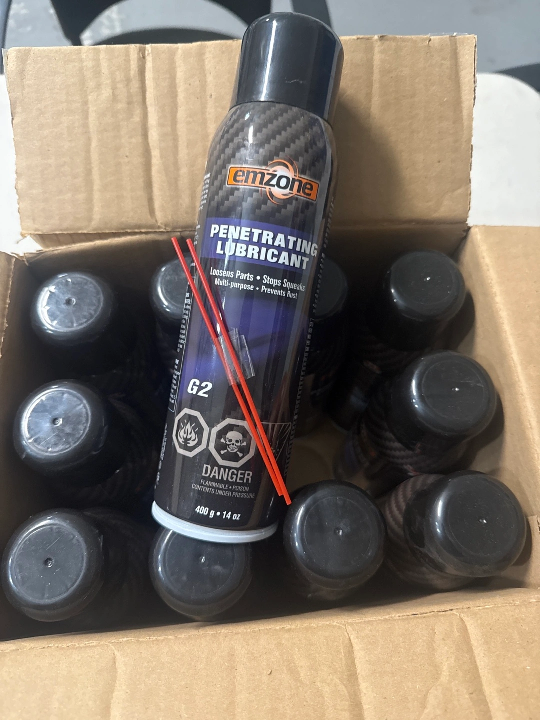 Selling a full box of Emzone Penetrating Lubricant cans! Each can is 14oz. There are 12 in total, all brand new and ready to tackle those squeaky parts! Box included