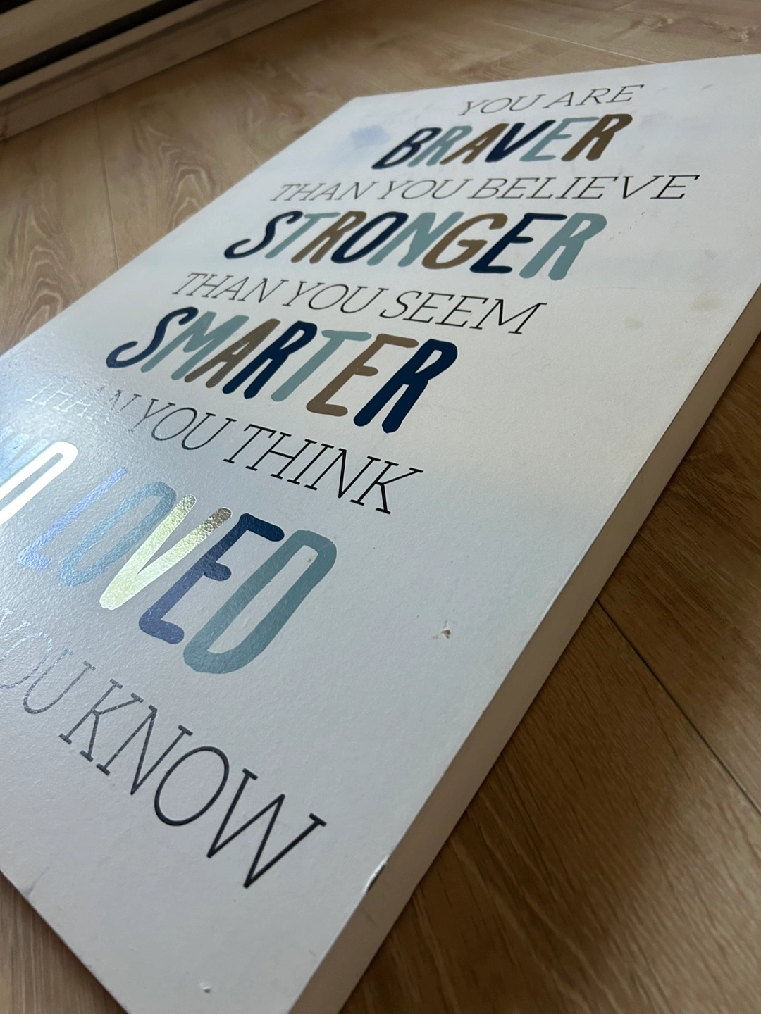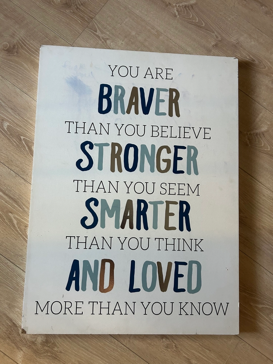 This inspirational wall art features the words: YOU ARE BRAVER THAN YOU BELIEVE STRONGER THAN YOU SEEM SMARTER THAN YOU THINK AND LOVED MORE THAN YOU KNOW The dimensions are approximately 20 inches by 16 inches