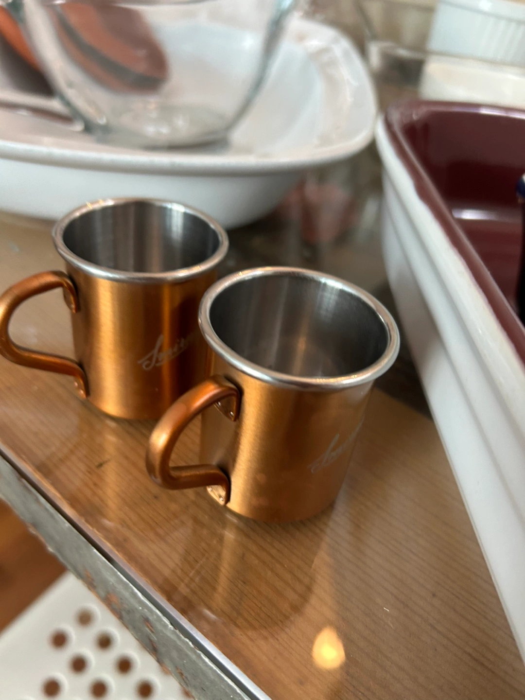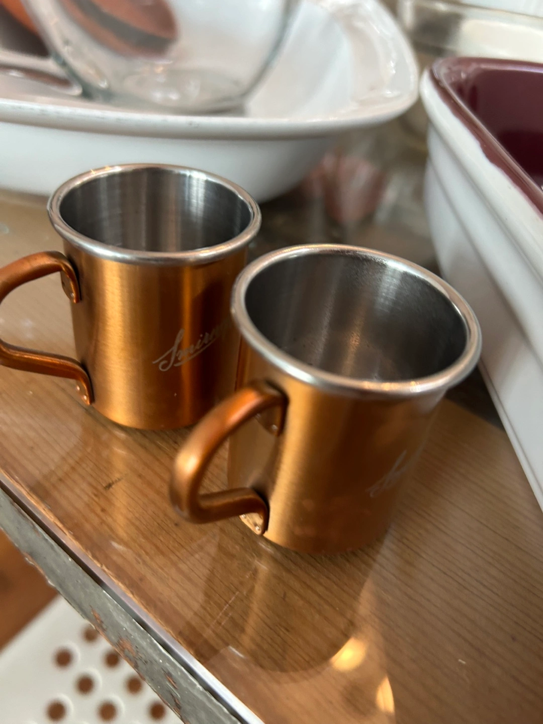 Here's a cute set of two copper-coloured mugs! They're in great shape and ready for a new home