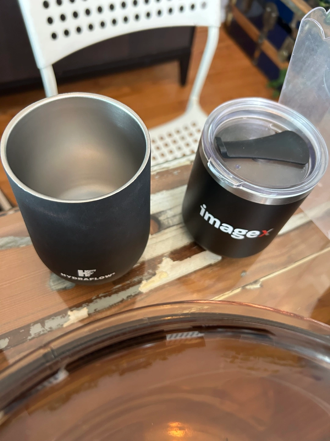 Selling a set of two tumblers. One is a black Hydraflow tumbler and the other is a black ImageX tumbler with a lid. Both are in great condition and ready for your favourite beverages!