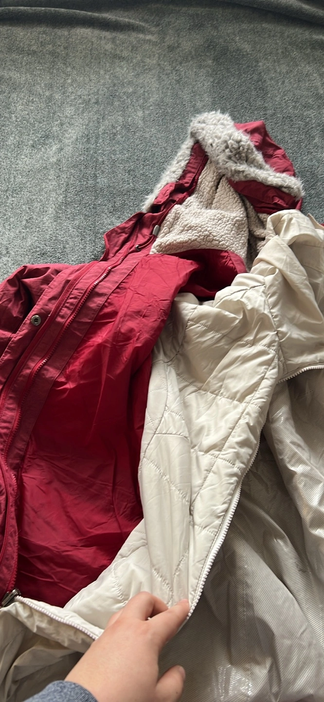 Here's a Columbia women's winter jacket in red. It's in good condition and ready to keep you warm this winter! It features a faux fur hood and a zip-out inner layer.