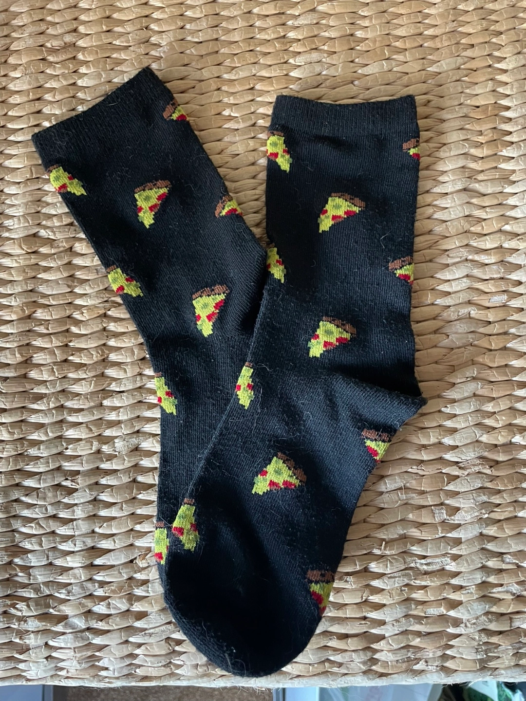 Here's a pair of fun black socks with a pizza print. They are in new condition without tags. They’d fit a dude 6 or 7 foot.