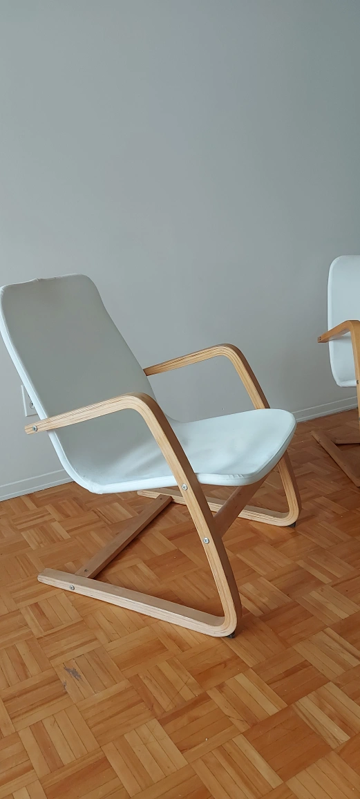These stylish armchairs feature a sleek white seat and a light wood frame, perfect for adding a touch of modern Slip covers that can be removed and washed in the machine.They're in great shape and ready for a new home!